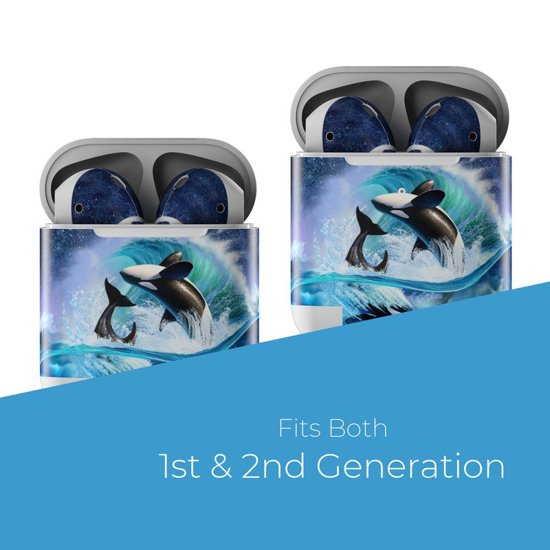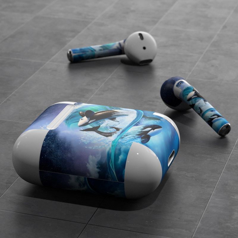 iStyles Apple AirPods Skin design of Dolphin, Short-beaked common dolphin, Sky, Cetacea, Killer whale, Marine mammal, Water, Illustration, Bottlenose dolphin, Common bottlenose dolphin, with black, blue, white, green colors, and tagged with animals, nature, signs, space, animals, beach, ocean, waterlife, whale, whales, yingyang.