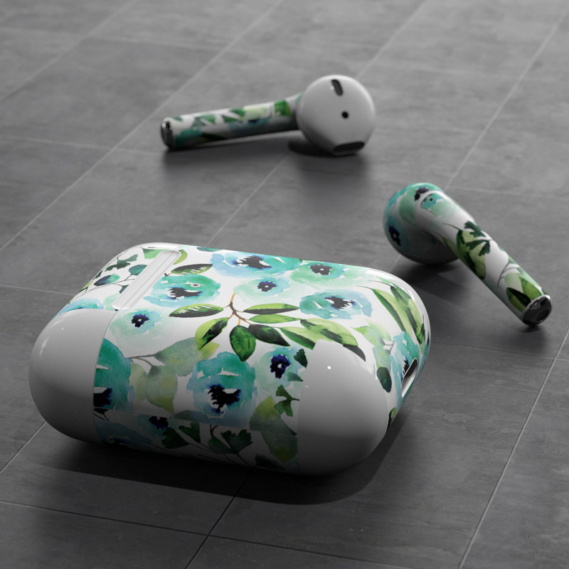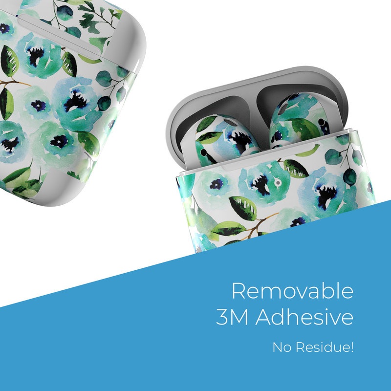 iStyles Apple AirPods Skin design of Green, Pattern, Leaf, Aqua, Plant, Design, Branch, Organism, Flower, Ivy, with white, green, blue, black colors, and tagged with flowers, patterns, floral, flowers, pattern, peonies, sara, saraberrenson, watercolor.