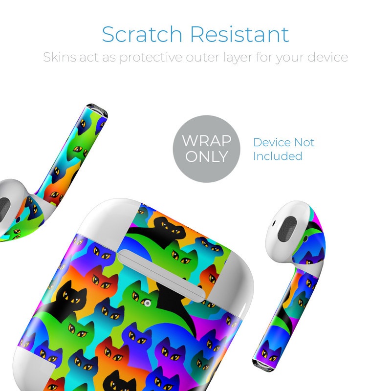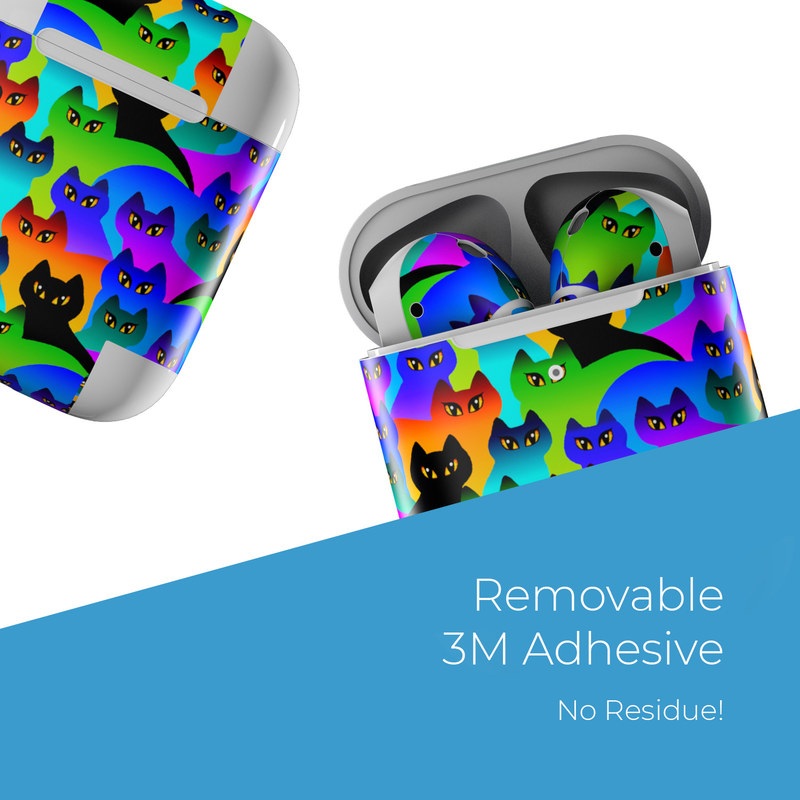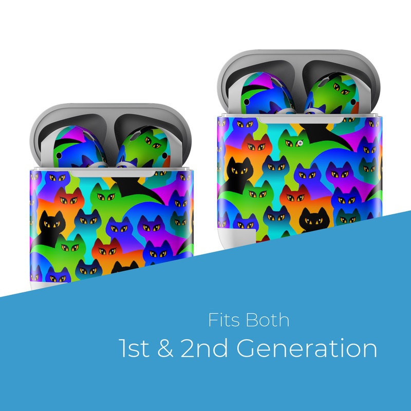 iStyles Apple AirPods Skin design of Black cat, Purple, Cat, Small to medium-sized cats, Pattern, Design, Felidae, Illustration, Art, with black, blue, green, purple colors, and tagged with animals.