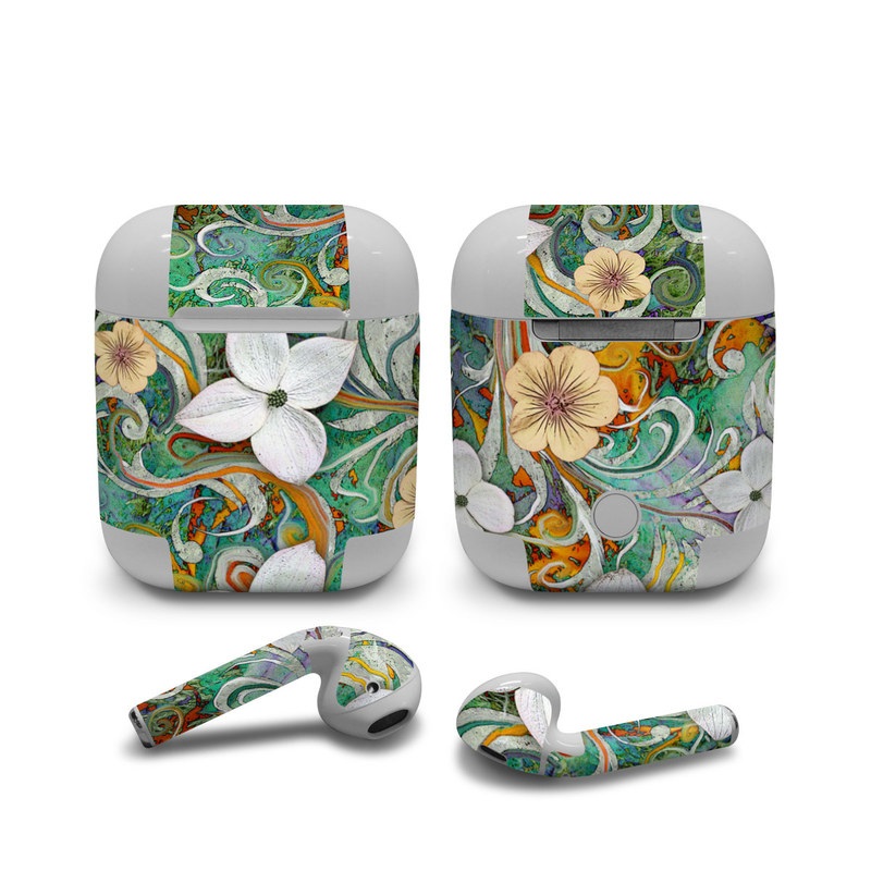 iStyles Apple AirPods Skin design of Flower, Pattern, Plant, Wildflower, Floral design, Petal, Art, Painting, Visual arts, Wallpaper, with gray, black, green, blue, red colors, and tagged with flowers.