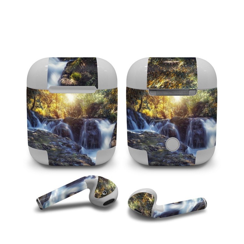 iStyles Apple AirPods Skin design of Waterfall, Natural landscape, Body of water, Nature, Water resources, Water, Watercourse, Stream, Nature reserve, Rock, with gray, yellow, orange, green, white, blue colors, and tagged with nature, photos, hiking, landscapes, outdoors, photography, waterfall.