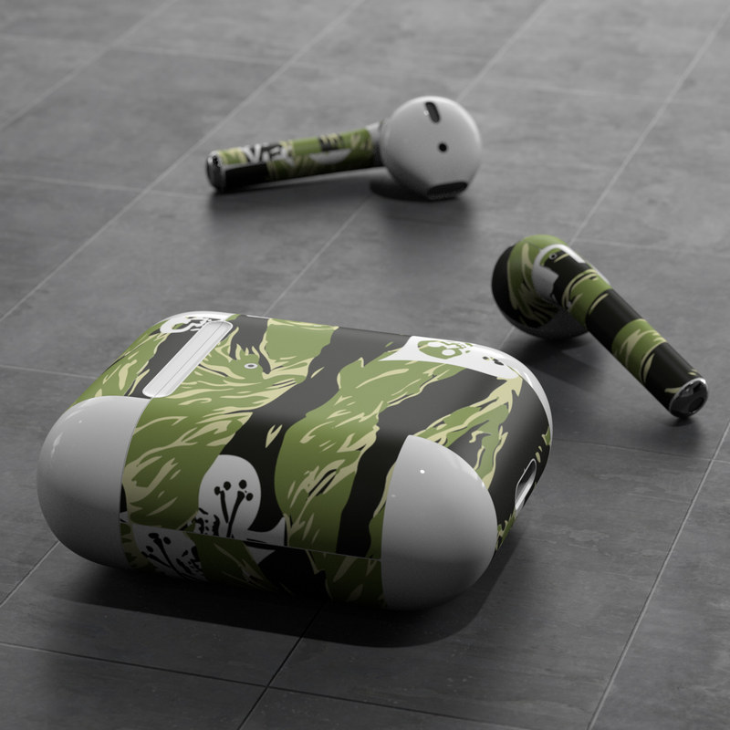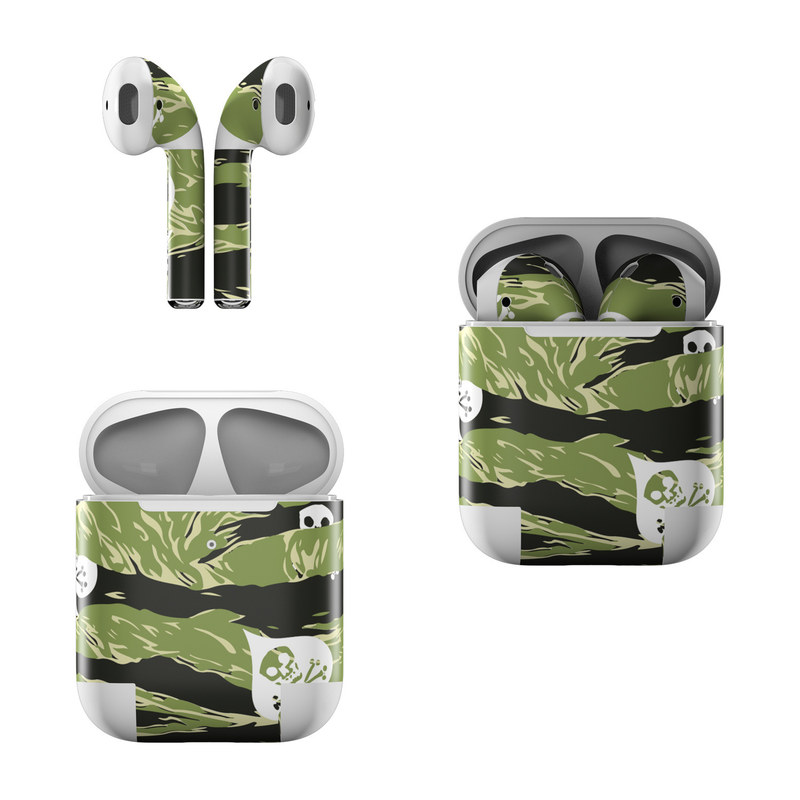 iStyles Apple AirPods Skin design of Military camouflage, Pattern, Leaf, Illustration, Design, Tree, Camouflage, Plant, Art, Branch, with black, white, green colors, and tagged with military, skulls, signs, patterns, athlete, fitness, gym, skull, skulls, spade.