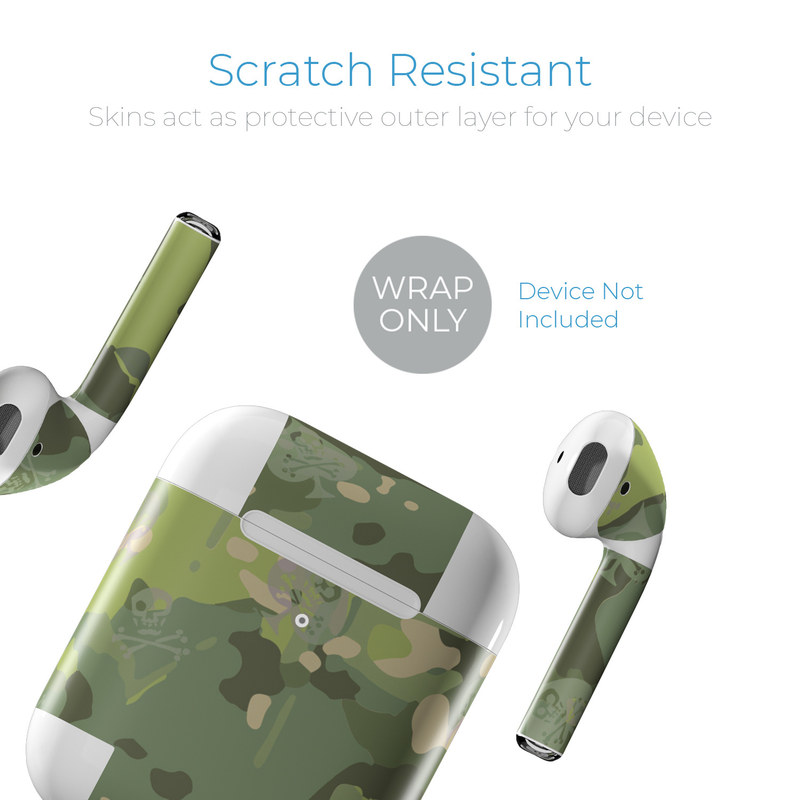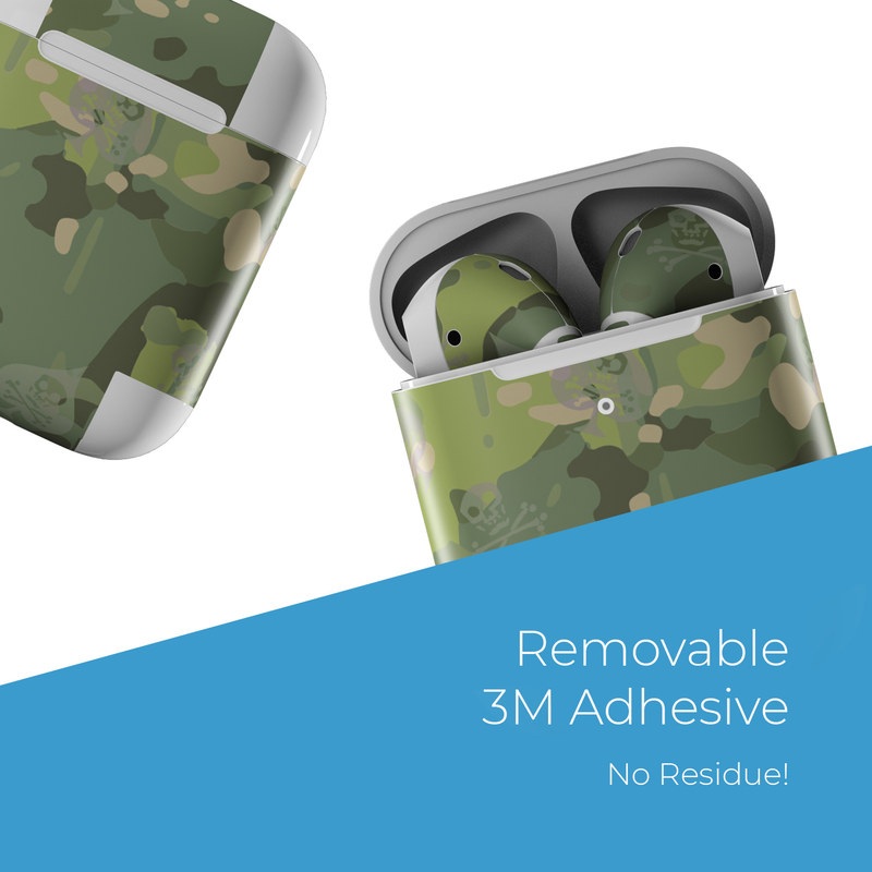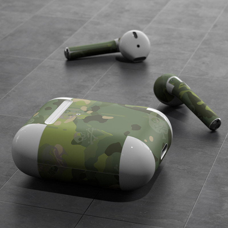 iStyles Apple AirPods Skin design of Military camouflage, Pattern, Camouflage, Uniform, Clothing, Green, Design, Leaf, Plant, Illustration, with green, brown colors, and tagged with military, skulls, patterns, athlete, fitness, gym, skull, skulls, spade.