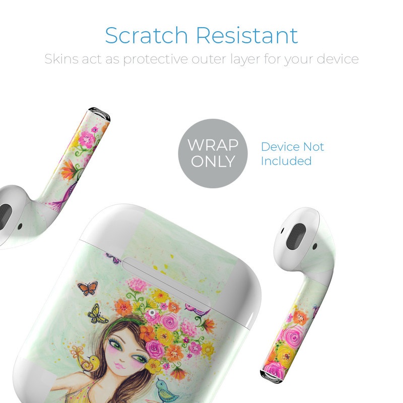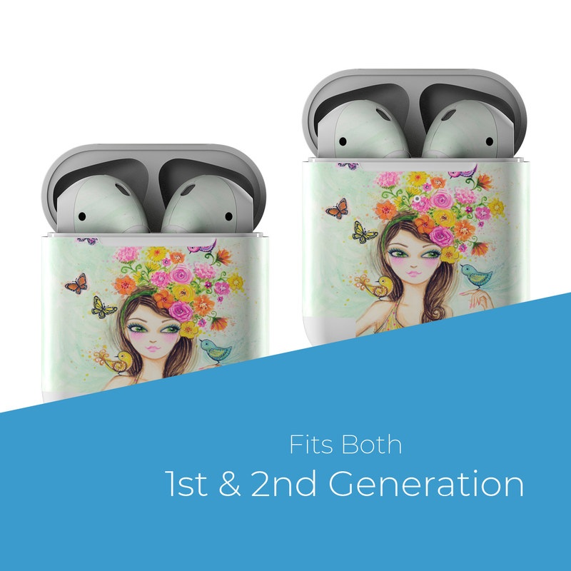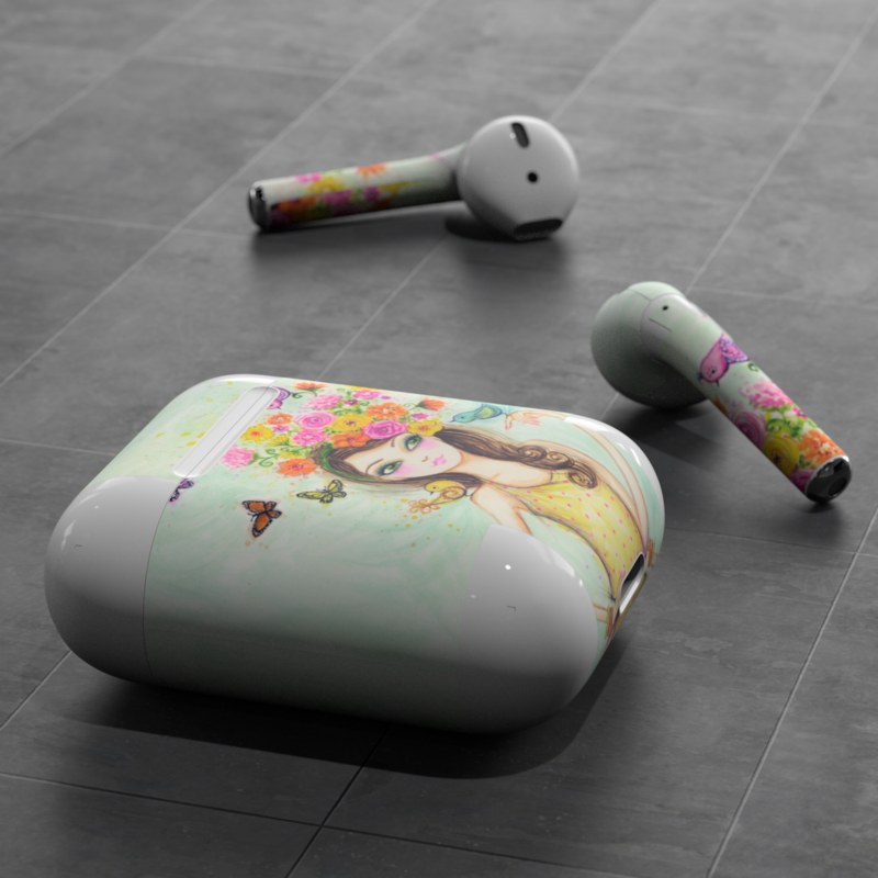 iStyles Apple AirPods Skin design of Pink, Illustration, Fashion illustration, Watercolor paint, Fictional character, Dress, Hair accessory, Wildflower, Costume, Plant, with blue, pink, yellow, orange, purple, brown, green colors, and tagged with people, fineart, animals, flowers, fashion, birds, dresses, fashion, flowers, spring.