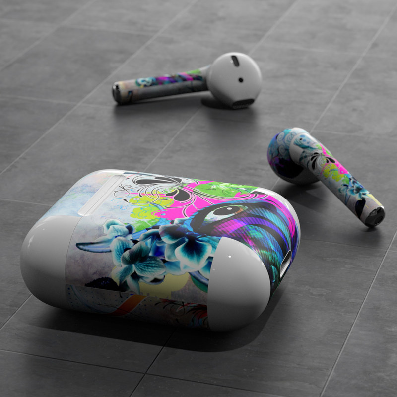 iStyles Apple AirPods Skin design of Graphic design, Psychedelic art, Art, Illustration, Purple, Visual arts, Graffiti, Street art, Design, Painting, with gray, black, blue, green, purple colors, and tagged with abstract, animals, flowers.