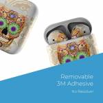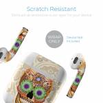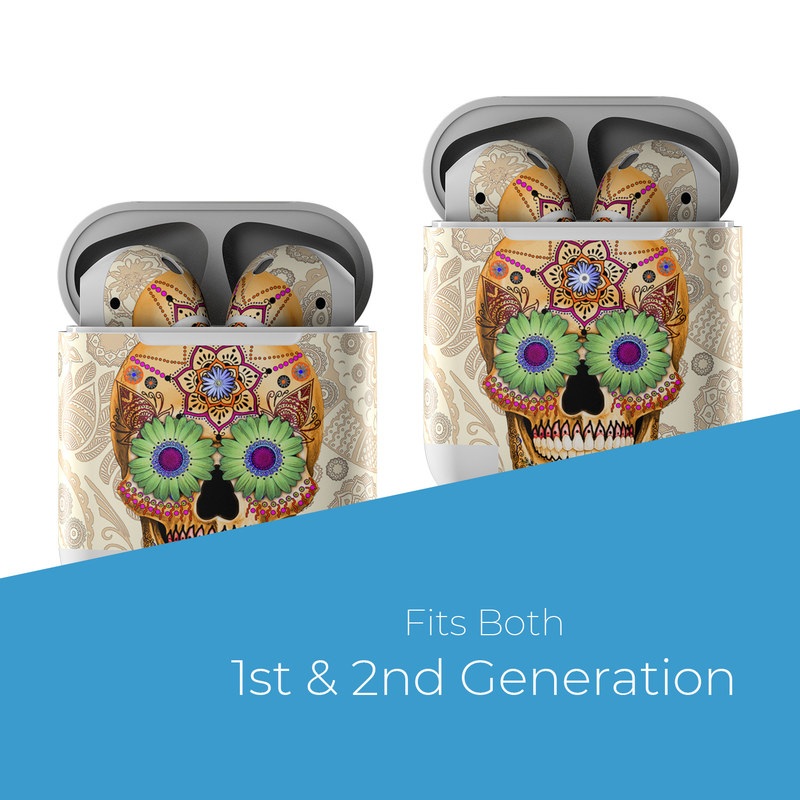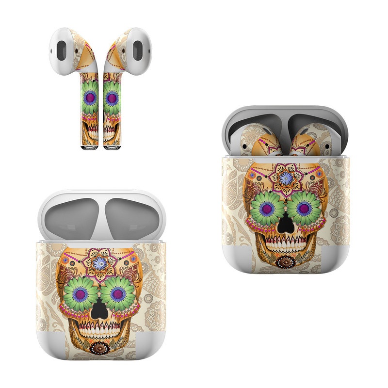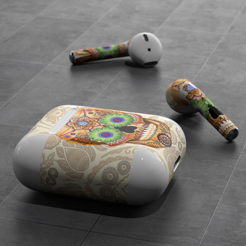 iStyles Apple AirPods Skin design of Skull, Bone, Pattern, Design, Illustration, Visual arts, Fashion accessory, Art, with gray, yellow, green, black, red, pink colors, and tagged with patterns, skulls, flowers, nature.