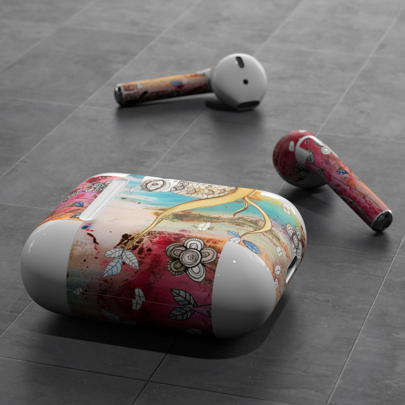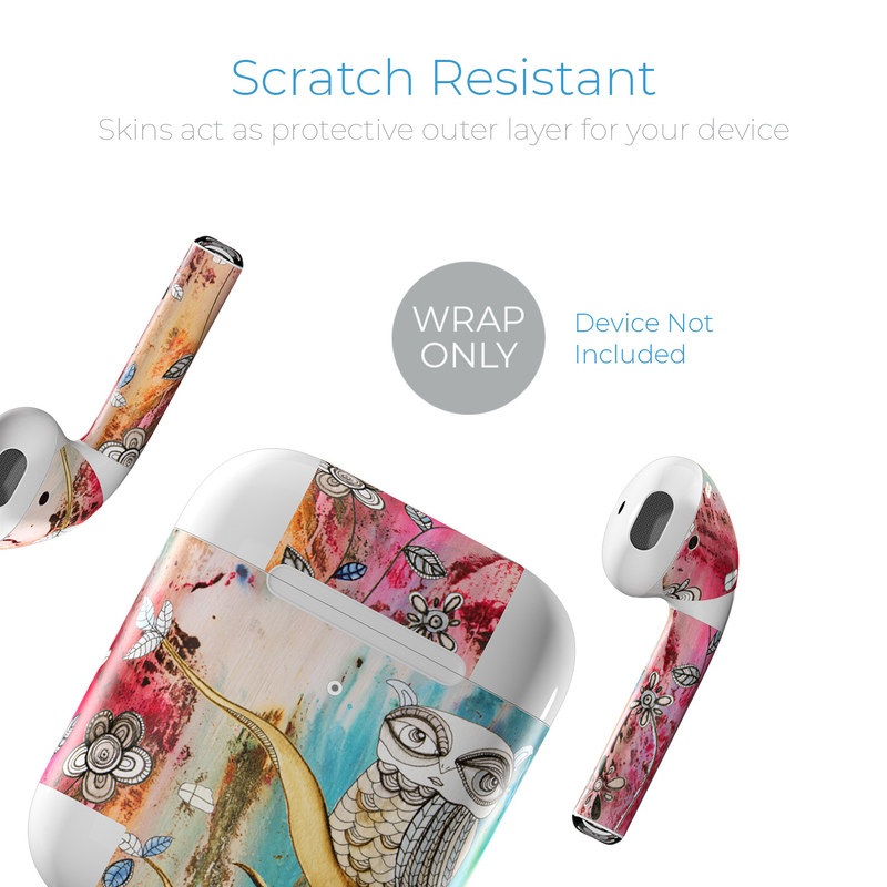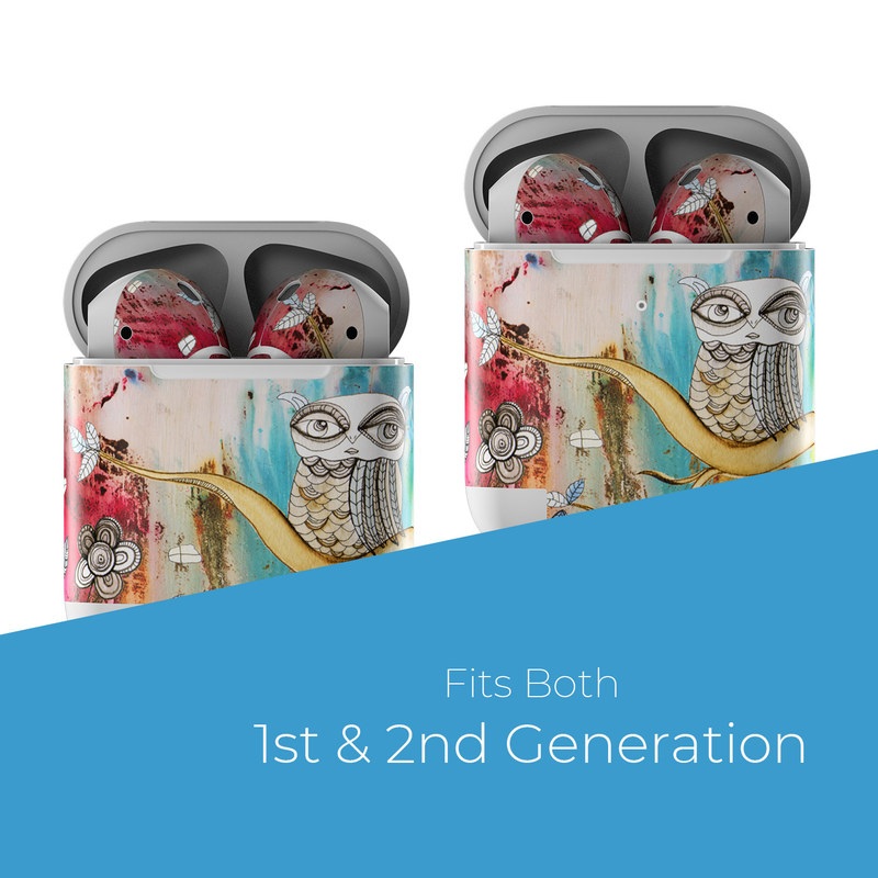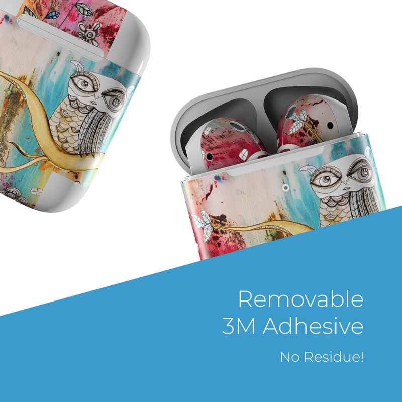 iStyles Apple AirPods Skin design of Owl, Pink, Illustration, Art, Visual arts, Watercolor paint, Organism, Modern art, Graphic design, Pattern, with gray, red, green, black, blue, purple colors, and tagged with patterns, animals, flowers.