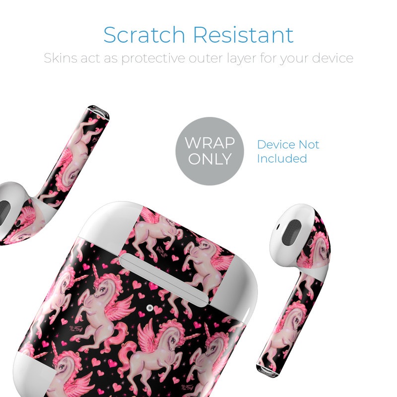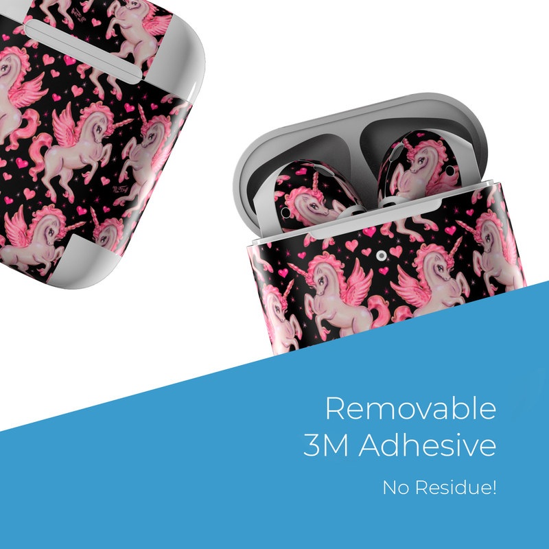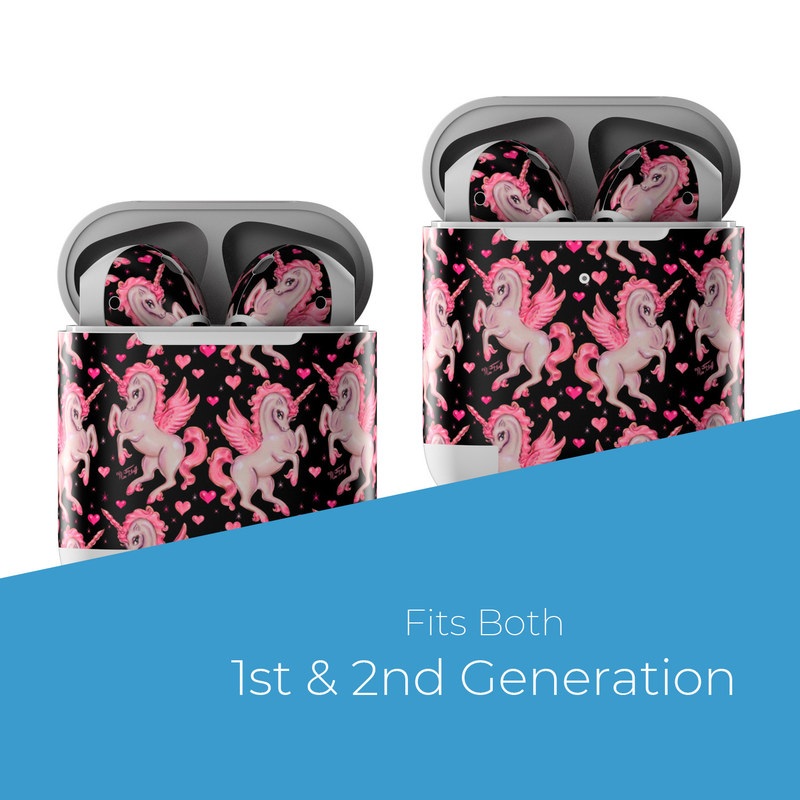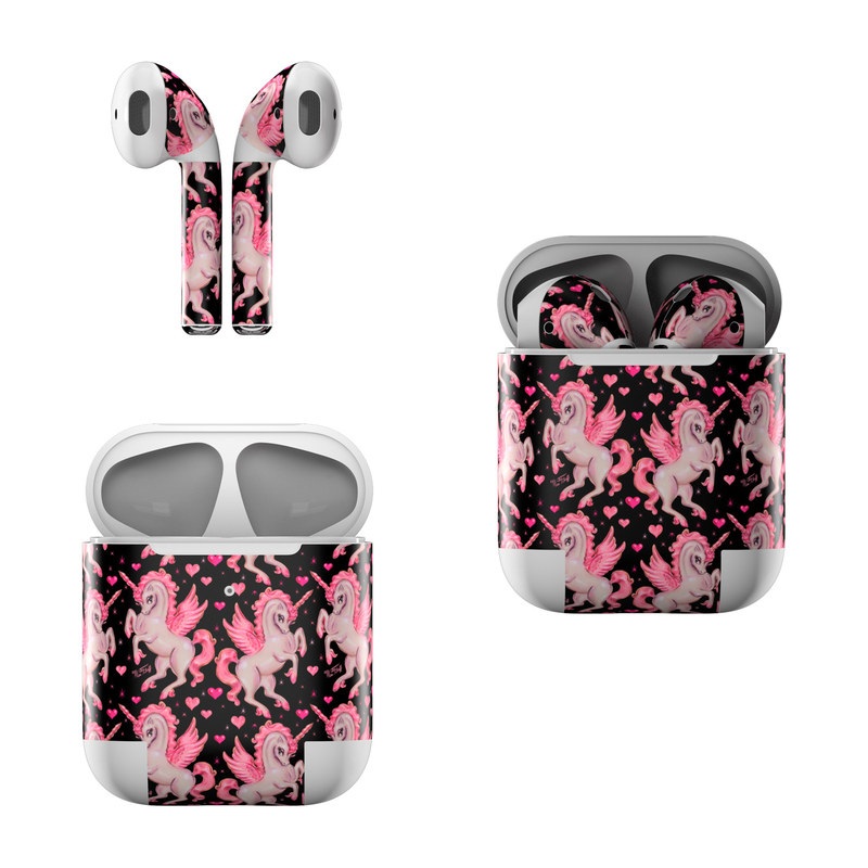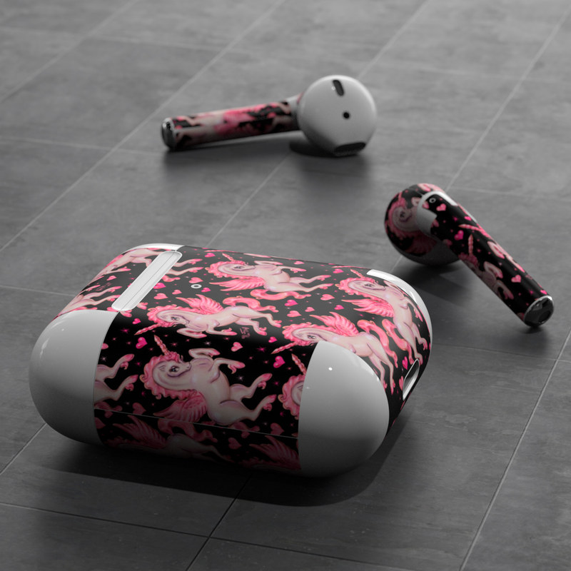 iStyles Apple AirPods Skin design of Pink, Pattern, Fictional character, Design, Illustration, Font, Unicorn, Graphic design, Mythical creature, Art, with black, pink colors, and tagged with patterns, animals, fantasy, black, hearts, pattern, pink, unicorn.