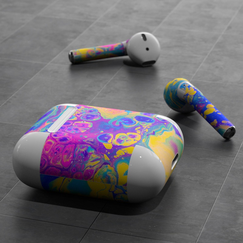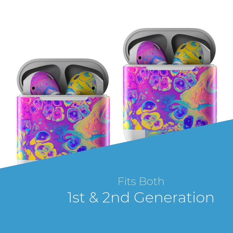 iStyles Apple AirPods Skin design of Psychedelic art, Pattern, Purple, Visual arts, Design, Art, Fractal art, Electric blue, Graphic design, Graphics, with blue, yellow, purple, pink colors, and tagged with abstract, fantasy, marble, paint, painting, rainbow, soap, tiedye.