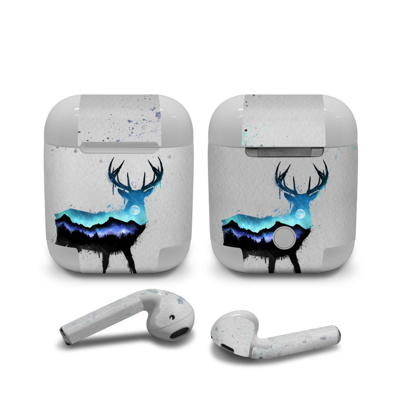 iStyles Apple AirPods Skin design of Reindeer, Deer, Illustration, Watercolor paint, Art, Elk, Wildlife, Drawing, Paint, Graphics, with gray, black, blue, purple, white colors, and tagged with animals, nature, space, animals, deer, moon, nature, night, stars, watercolor.