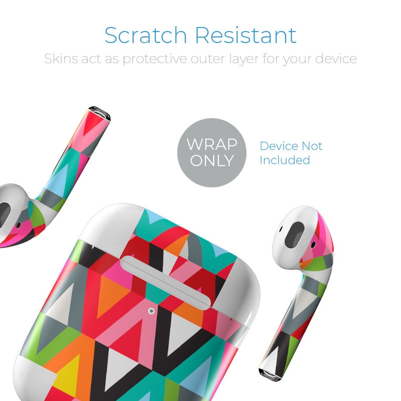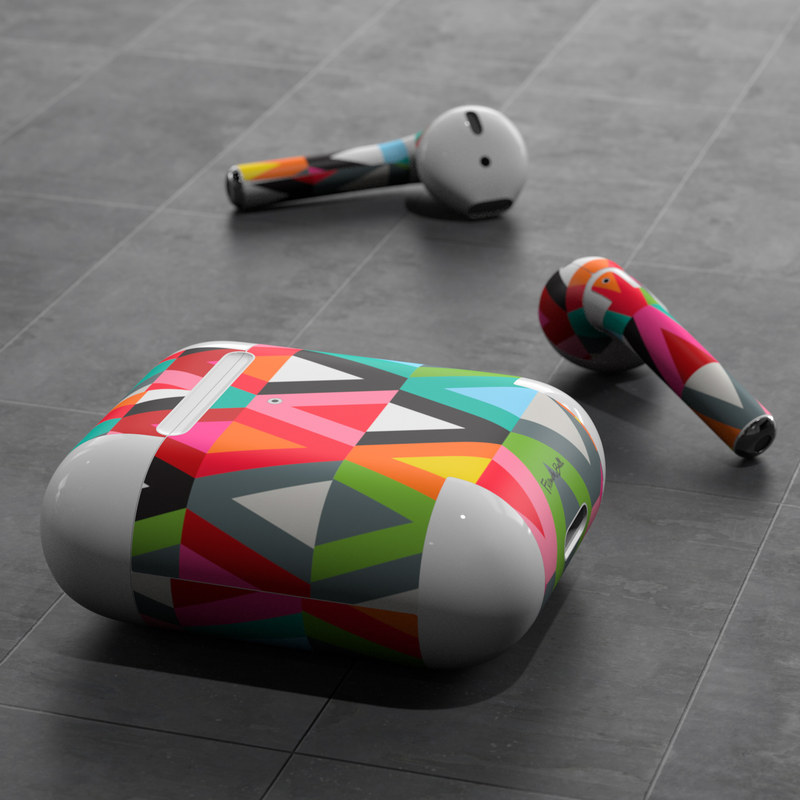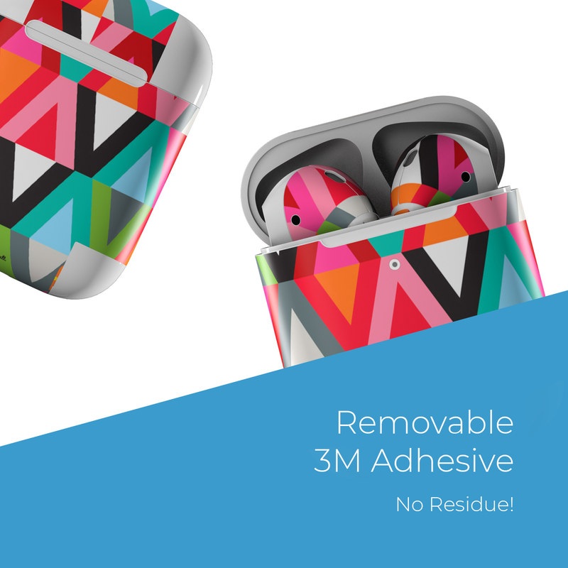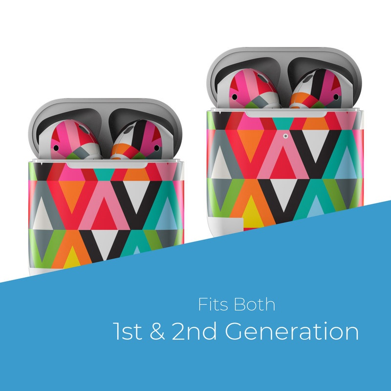 iStyles Apple AirPods Skin design of Pattern, Orange, Yellow, Graphic design, Colorfulness, Line, Design, Symmetry, Triangle, Font, with black, white, red, orange, pink, blue, green, gray colors, and tagged with patterns, bright, colorful, pattern, spring, summer, triangles.