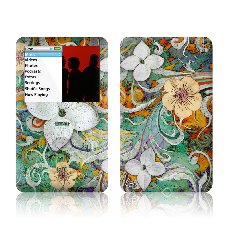 iStyles iPod classic Skin design of Flower, Pattern, Plant, Wildflower, Floral design, Petal, Art, Painting, Visual arts, Wallpaper, with gray, black, green, blue, red colors, and tagged with flowers.