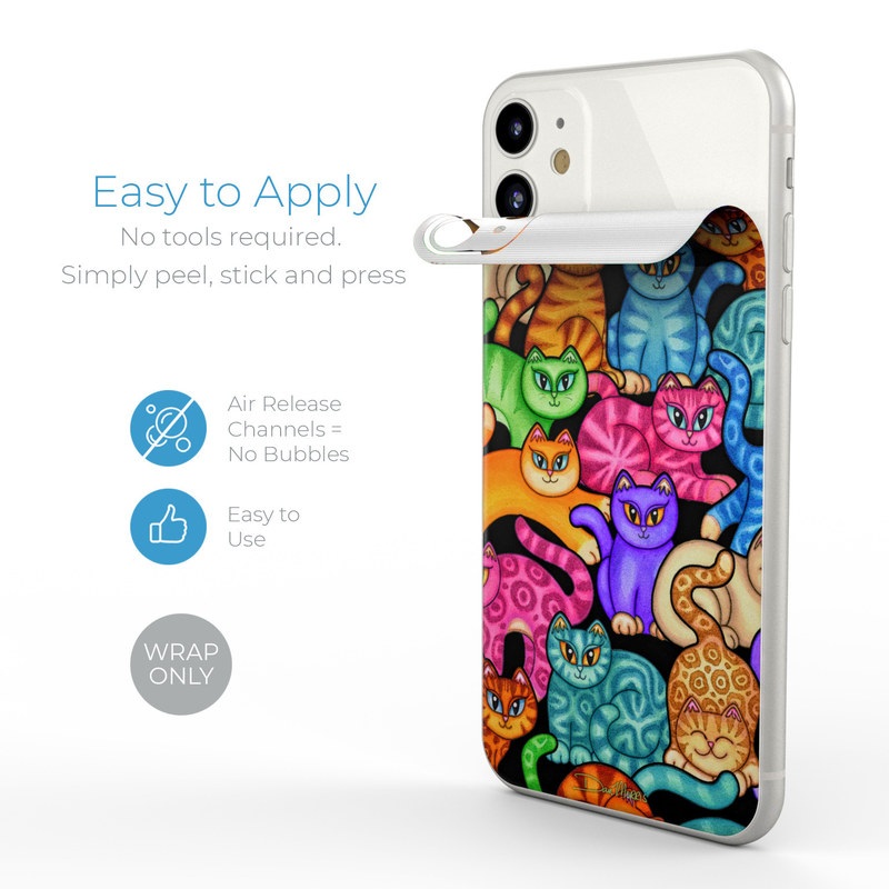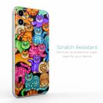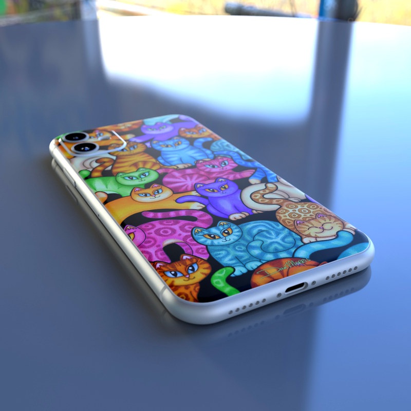 iStyles iPhone 11 Series Skin design of Cat, Cartoon, Felidae, Organism, Small to medium-sized cats, Illustration, Animated cartoon, Wildlife, Kitten, Art, with black, blue, red, purple, green, brown colors, and tagged with patterns, animals.