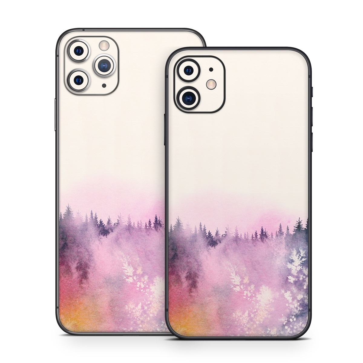 iStyles iPhone 11 Series Skin design of Watercolor paint, Sky, Atmospheric phenomenon, Tree, Atmosphere, Cloud, Landscape, Forest, Painting, Illustration, with white, yellow, pink, purple, blue, black colors, and tagged with nature, flowers, floral, nature, pine, plants, trees.