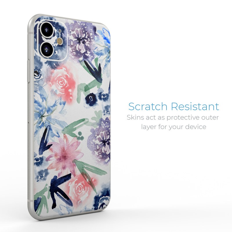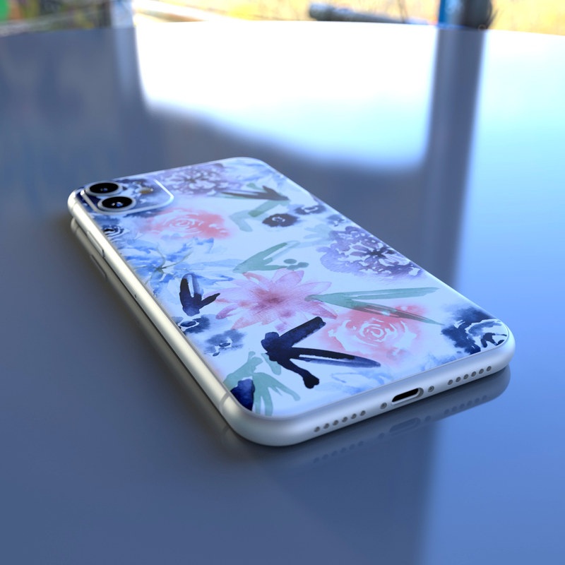 iStyles iPhone 11 Series Skin design of Pattern, Graphic design, Design, Floral design, Plant, Flower, Illustration, with white, blue, purple, green, pink colors, and tagged with flowers, patterns, florals, flowers, pattern, pink, violet, watercolor.