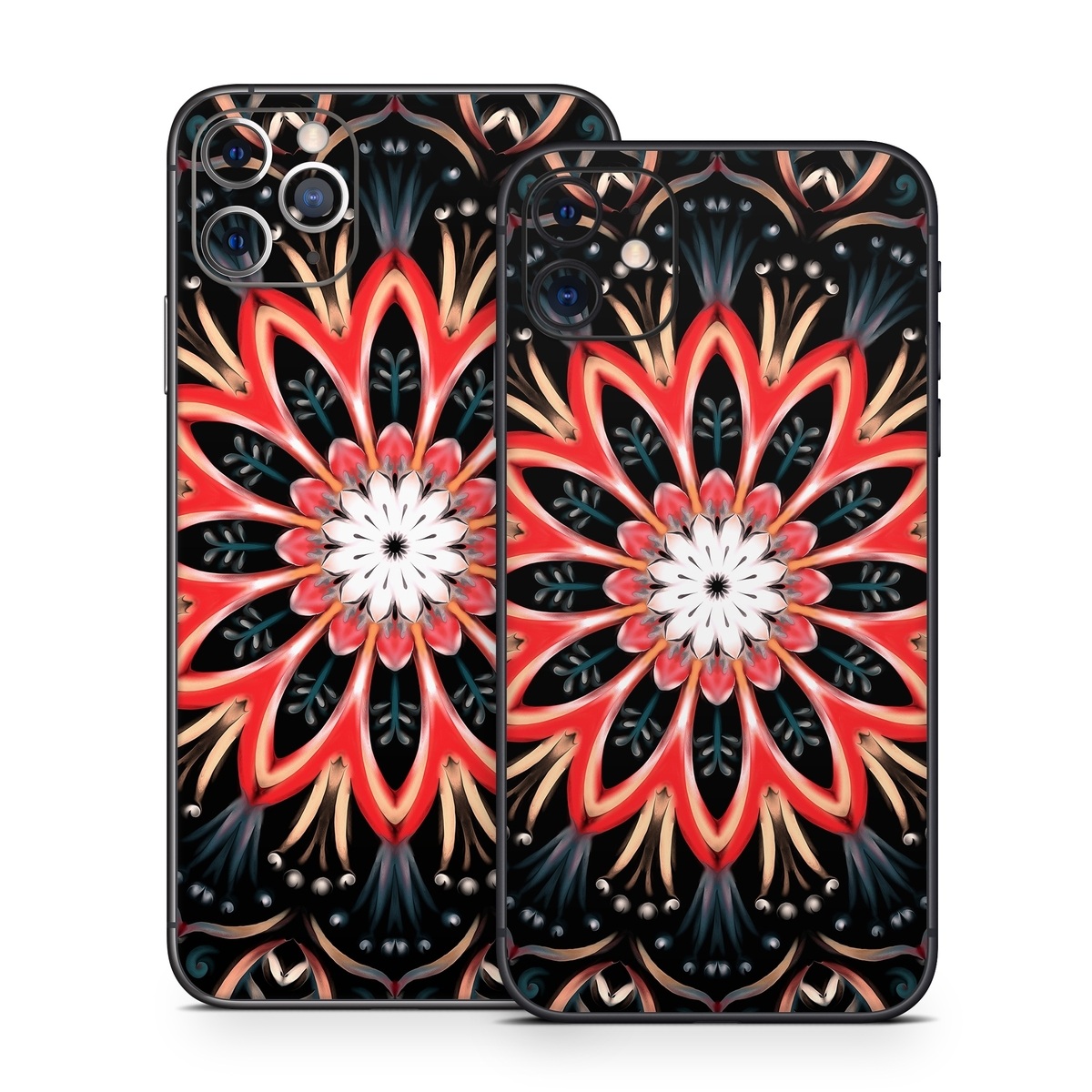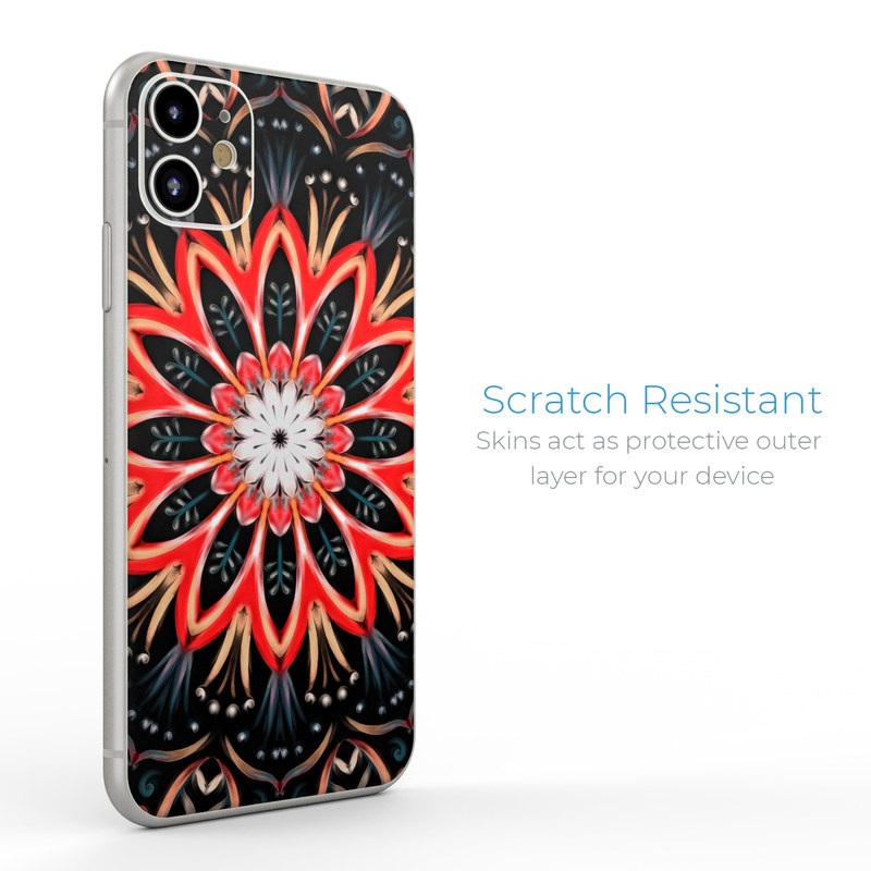 iStyles iPhone 11 Series Skin design of Pattern, Psychedelic art, Symmetry, Design, Art, Visual arts, Textile, Kaleidoscope, Fractal art, Ornament, with black, red, white, blue, yellow, orange colors, and tagged with patterns, flowers, abstract, abstract, blue, bright, floral, flower, orange, white.