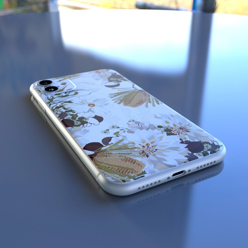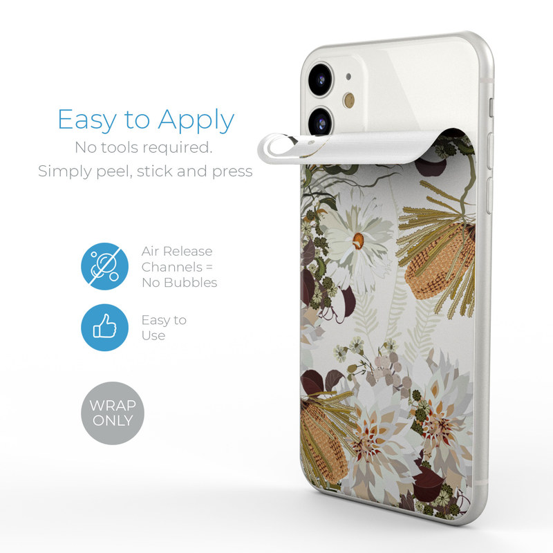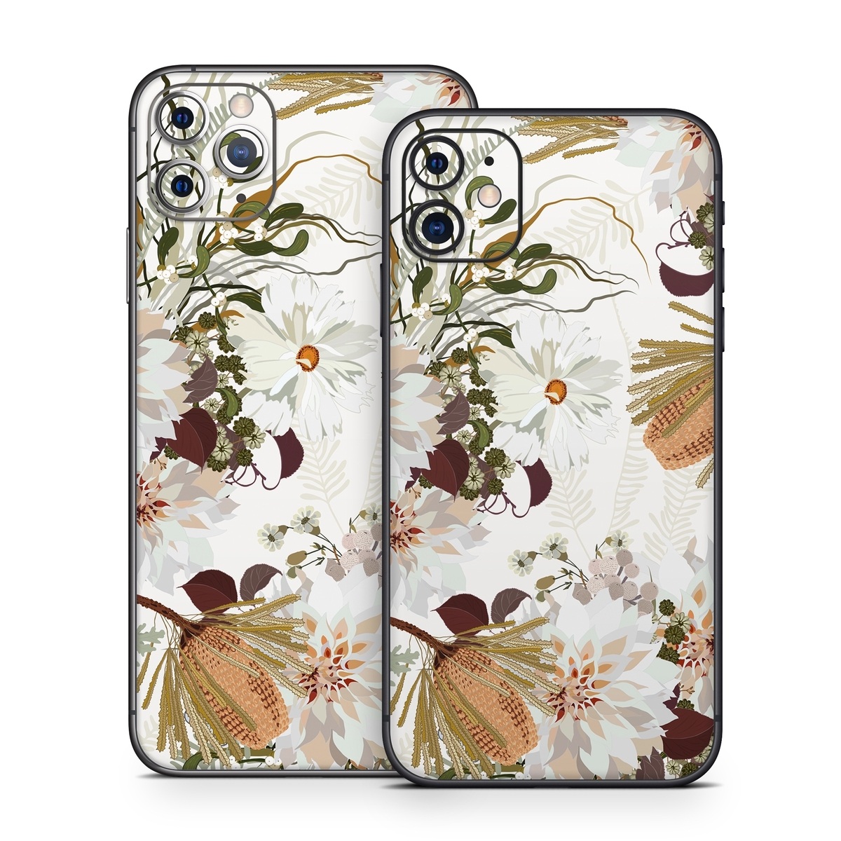iStyles iPhone 11 Series Skin design of Flower, Botany, Plant, Floral design, Wildflower, Pattern, Wallpaper, Textile, Petal, Butterfly, with white, brown, green, gray colors, and tagged with nature, patterns, flowers, brown, cream, filigree, floral, flower, flowers, green, leaf, leaves, nature, neutral, outdoor.