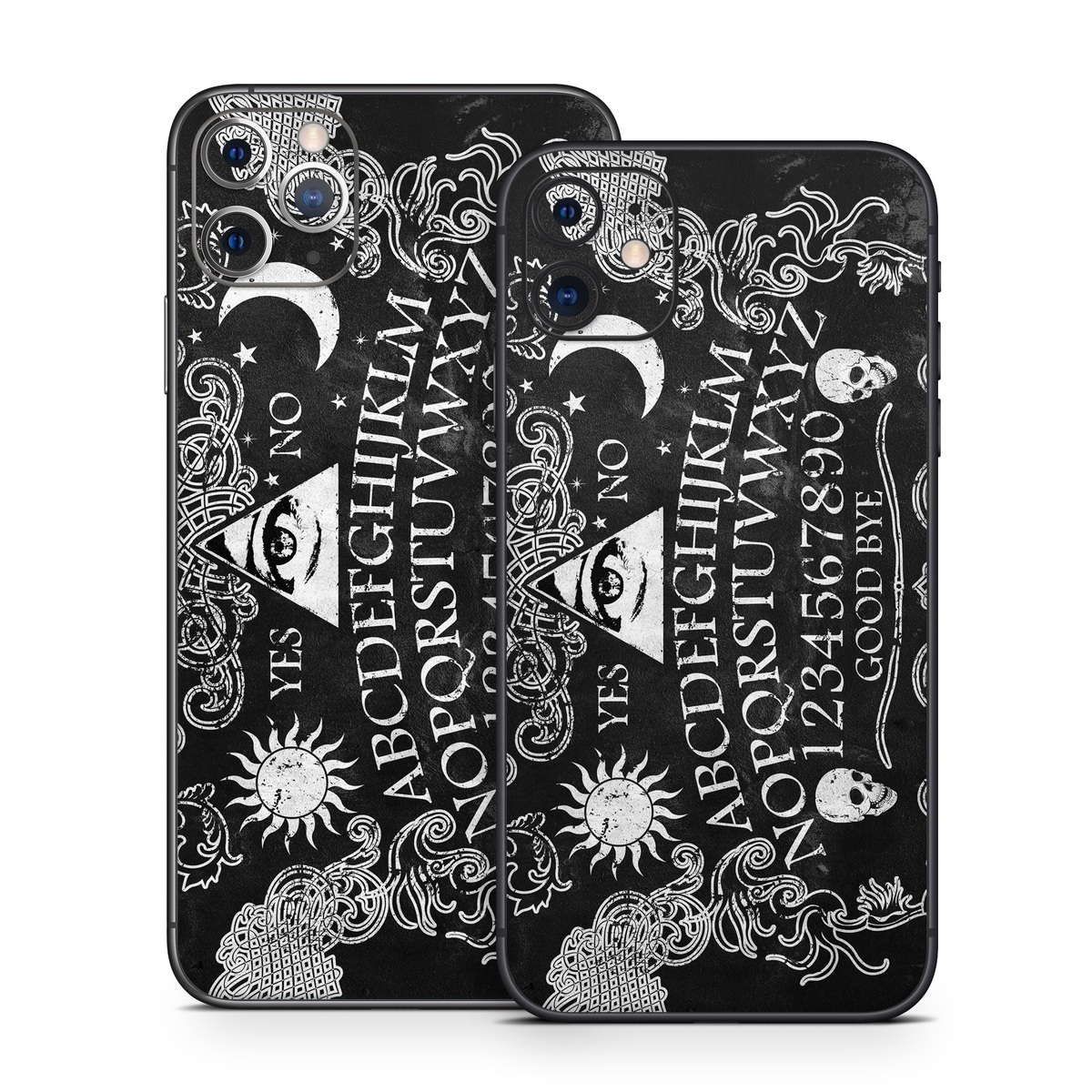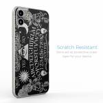 iStyles iPhone 11 Series Skin design of Text, Font, Pattern, Design, Illustration, Headpiece, Tiara, Black-and-white, Calligraphy, Hair accessory, with black, white, gray colors, and tagged with signs, skulls, black, demons, ghosts, magic, magick, paranormal, skull, spirit, talking.