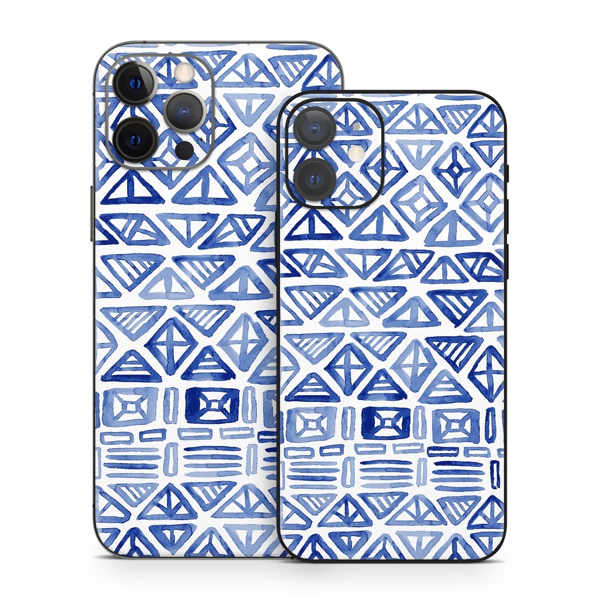iStyles iPhone 12 Series Skin design of Pattern, Line, Design, Symmetry, Visual arts, Parallel, with white, blue colors, and tagged with patterns, blue, geometric, magpiemoon, pattern, tribal, watercolor, white.