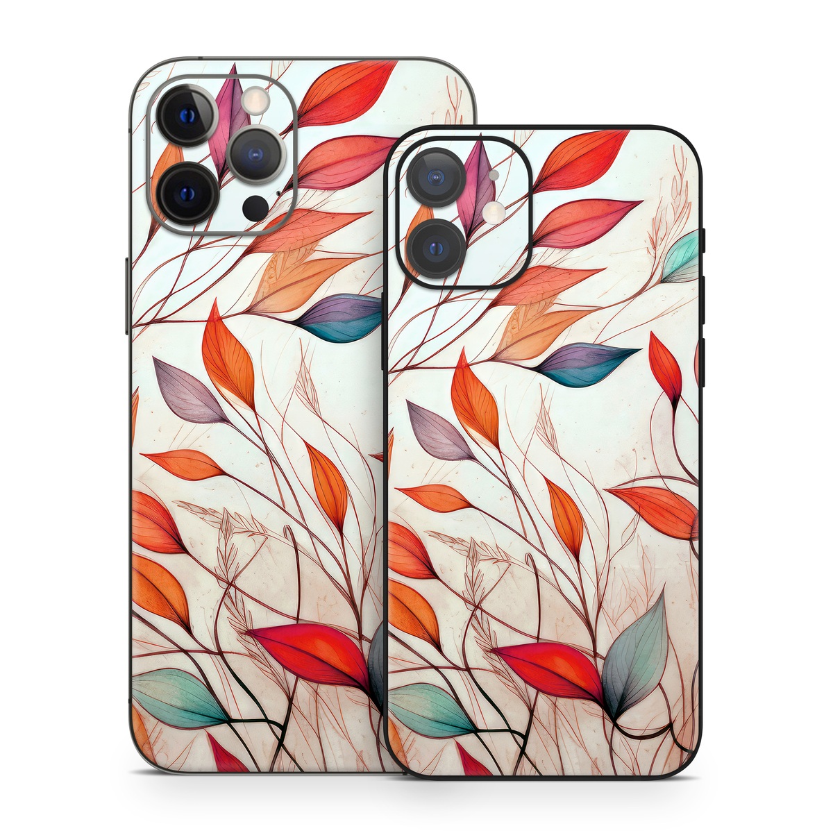 iStyles iPhone 12 Series Skin design of Plant, Vertebrate, Art paint, Nature, Botany, Leaf, Branch, Twig, Textile, Orange, with yellow, orange, red, white, brown, blue colors, and tagged with nature, autumn, fall, leaves.