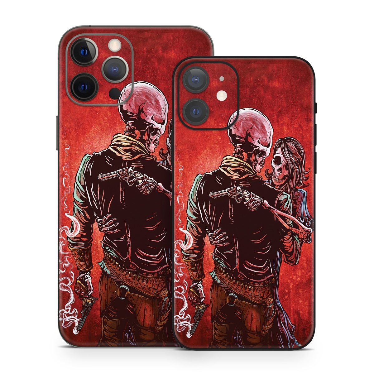 iStyles iPhone 12 Series Skin design of Sleeve, Gesture, Painting, Art, Artist, Fictional character, Drawing, Paint, Illustration, Visual arts, with red, black, white, gray, brown colors, and tagged with skulls, objects, honesty, mistrust, faith, smoking, gun, couple.