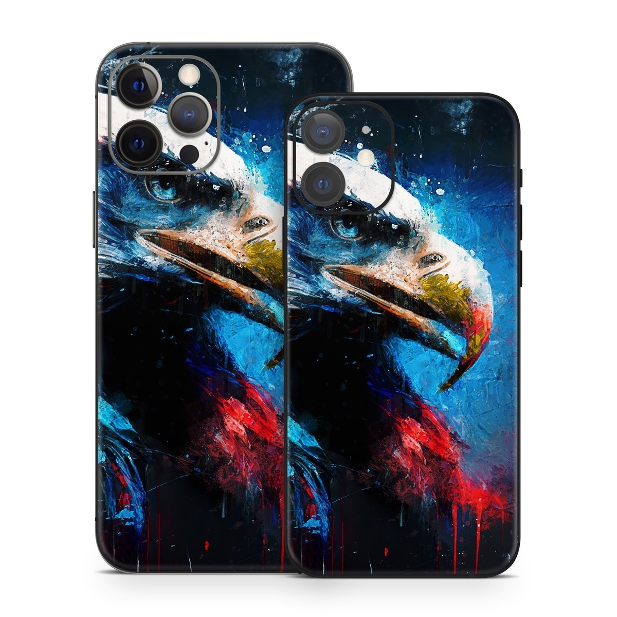 iStyles iPhone 12 Series Skin design of Bird, Beak, Organism, Art, Feather, Paint, Painting, Accipitridae, Bird of prey, Electric blue, with blue, red, white, black, gray, yellow colors, and tagged with animals, america, usa.