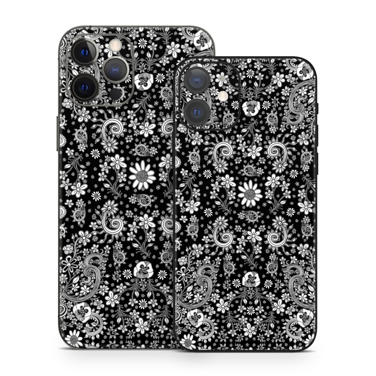 iStyles iPhone 12 Series Skin design of Pattern, Monochrome, Design, Black-and-white, Visual arts, Textile, Motif, Monochrome photography, Symmetry, with black, white colors, and tagged with patterns, flowers, blackandwhite, doodles, florals, flowers, sketches.