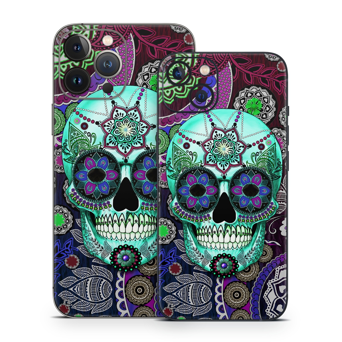 iStyles iPhone 13 Series Skin design of Psychedelic art, Pattern, Skull, Purple, Bone, Violet, Design, Visual arts, Art, Magenta, with blue, green, purple, red, green, pink colors, and tagged with skulls, patterns, flowers.