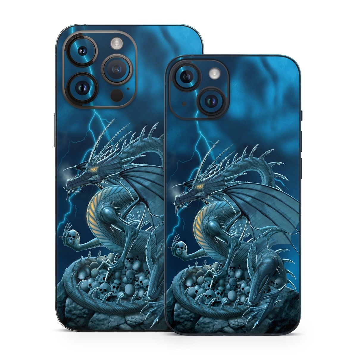 iStyles iPhone 14 Series Skin design of Cg artwork, Dragon, Mythology, Fictional character, Illustration, Mythical creature, Art, Demon, with blue, yellow colors, and tagged with fantasy, skulls.