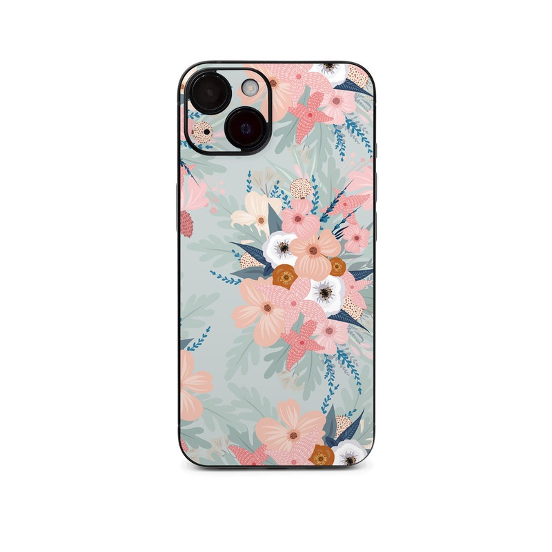 iStyles iPhone 14 Series Skin design of Pattern, Aqua, Wrapping paper, Textile, Design, Floral design, Wildflower, Plant, Pedicel, Blossom, with pink, red, blue, white colors, and tagged with patterns, flowers, florals, flowers, garden, green, pastelcolors, pink.