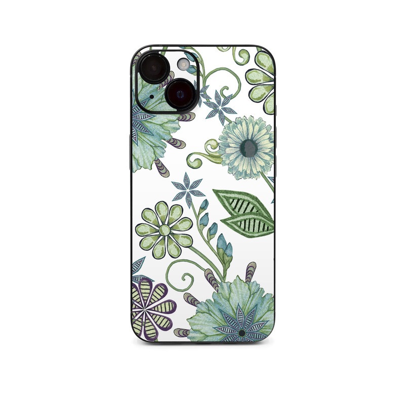 iStyles iPhone 14 Series Skin design of Green, Pattern, Flower, Botany, Plant, Leaf, Design, Wildflower, with white, green, blue colors, and tagged with patterns, flowers.