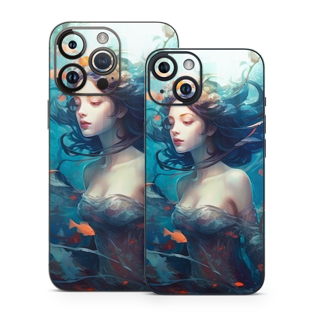 iStyles iPhone 14 Series Skin design of Azure, Organism, Aqua, Art, Electric blue, Cg artwork, Visual arts, Graphics, Pattern, Painting, with red, blue, yellow, orange, white, black colors, and tagged with fineart, animals, people, fantasy, nature, ocean, sea, light, fishes, mermaid, girl, woman, underwater.