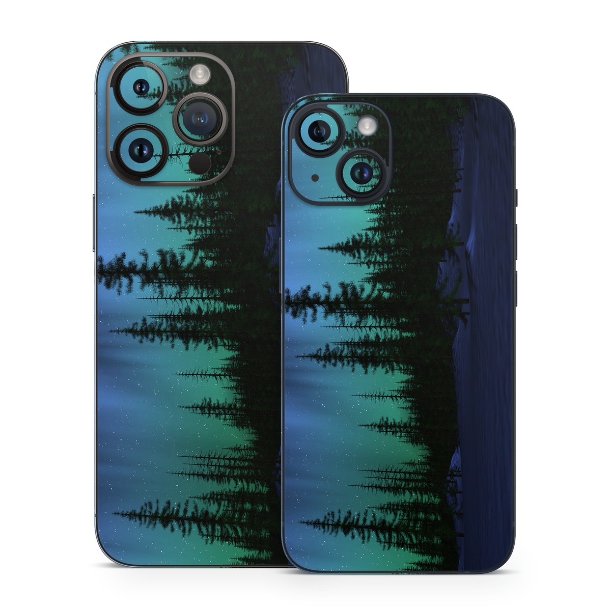 iStyles iPhone 14 Series Skin design of Aurora, Nature, Sky, shortleaf black spruce, Natural landscape, Tree, Wilderness, Natural environment, Biome, Spruce-fir forest, with blue, purple, green, black colors, and tagged with nature, photos.