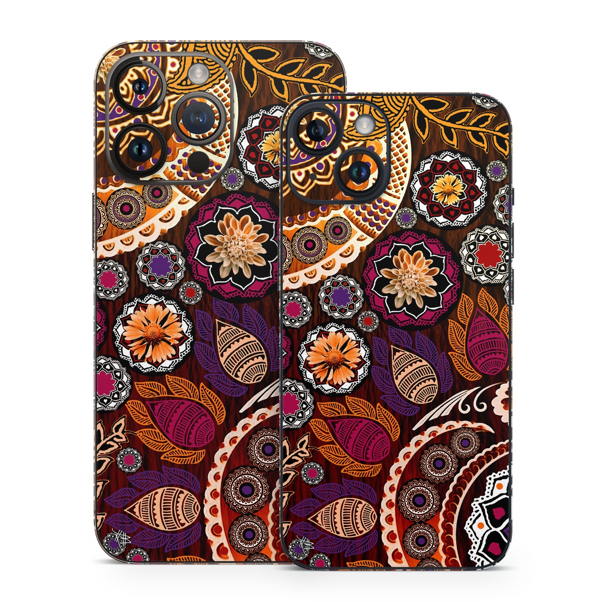 iStyles iPhone 14 Series Skin design of Pattern, Motif, Visual arts, Design, Art, Floral design, Textile, Paisley, Tapestry, Circle, with brown, purple, red, white, black colors, and tagged with patterns, flowers, nature.