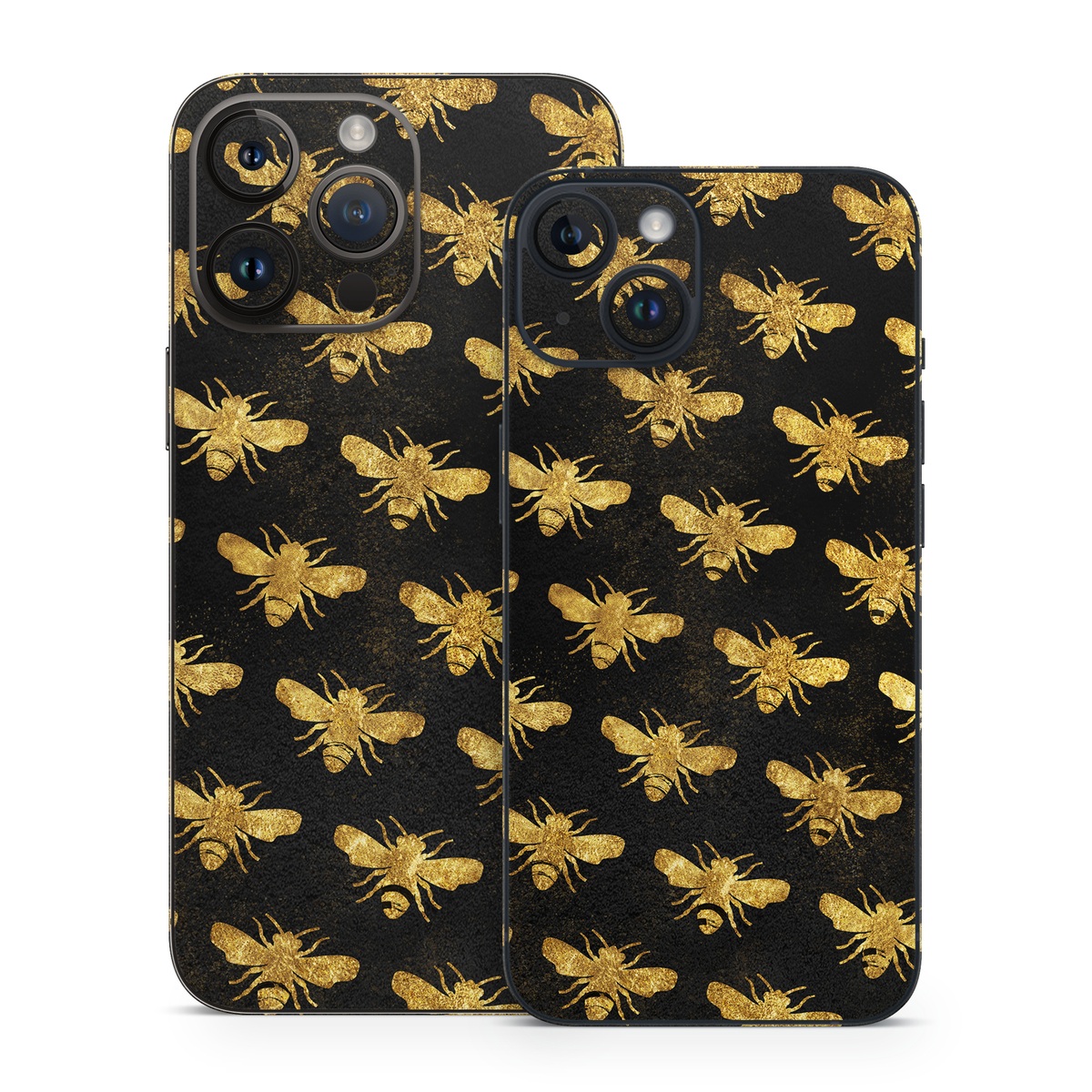 iStyles iPhone 14 Series Skin design of Pattern, Yellow, Flower, Design, Plant, Wildflower, Textile, Metal, with black, yellow colors, and tagged with patterns, animals, bee, bees, bugs, fashion, gold, insect.