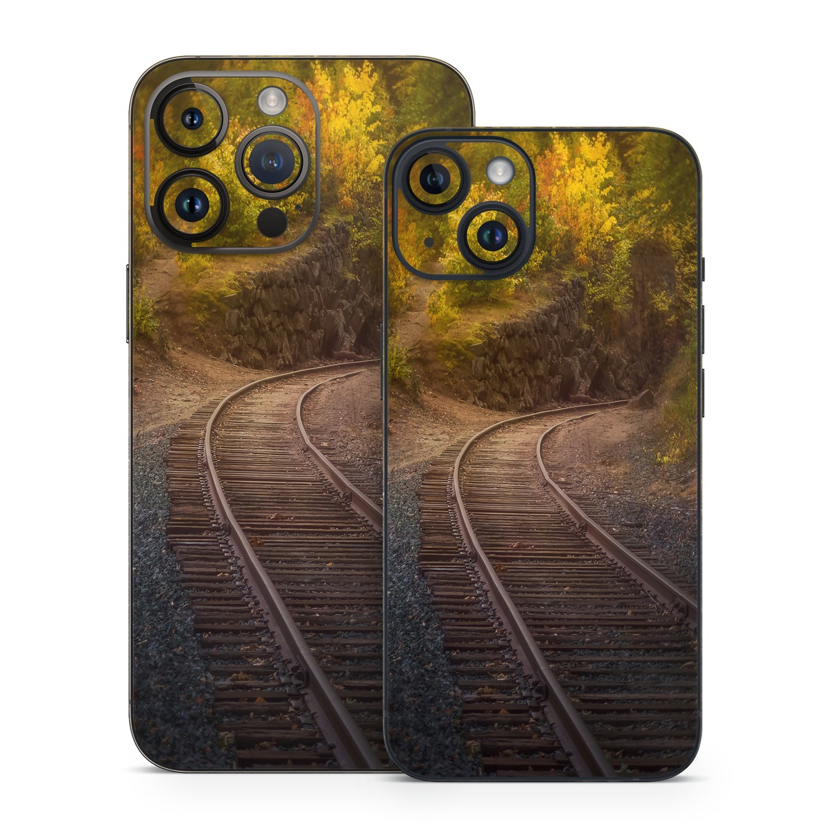 iStyles iPhone 14 Series Skin design of Plant, Wood, Branch, Natural landscape, Road surface, Track, Grass, Tree, Thoroughfare, Twig, with brown, gray, yellow, orange, green, red colors, and tagged with nature, objects, nature, outdoors, photography, train, traintracks.