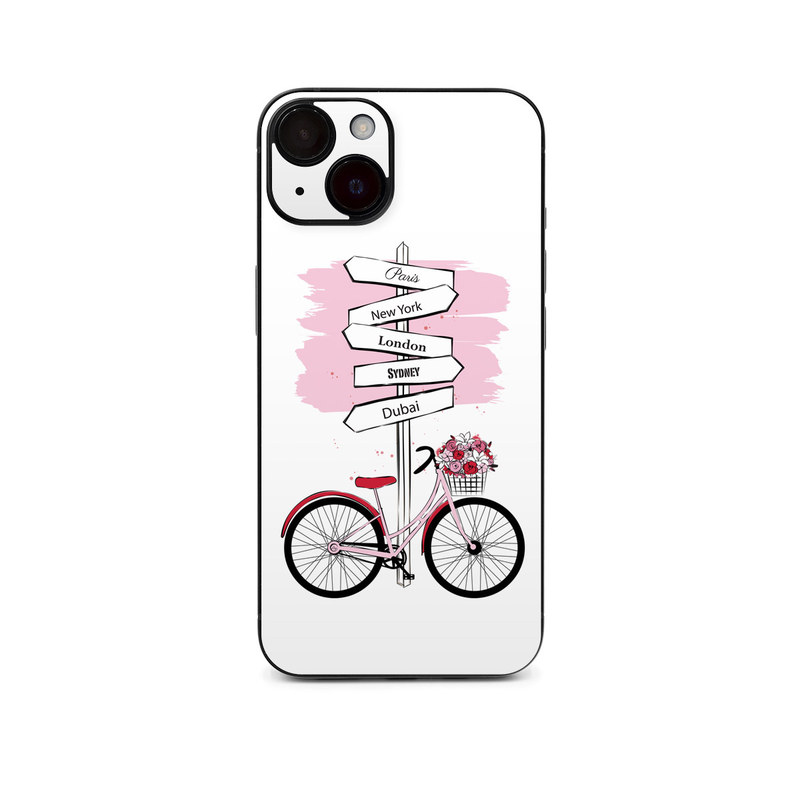 iStyles iPhone 14 Series Skin design of Bicycle, Wheel, Bicycles--Equipment and supplies, Tire, Bicycle tire, Bicycle frame, Bicycle wheel, Bicycle wheel rim, Vehicle, Bicycle fork, with white, black, red, pink colors, and tagged with signs, objects, flowers, patterns, bike, flowers, pink, travel, paris, new, york, london, sydney, dubai.
