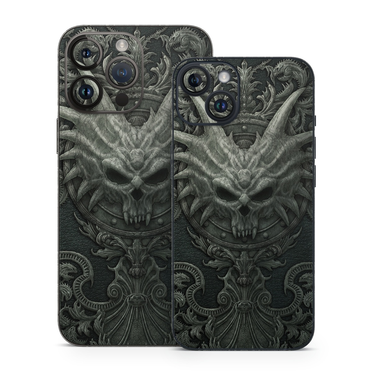 iStyles iPhone 14 Series Skin design of Demon, Dragon, Fictional character, Illustration, Supernatural creature, Drawing, Symmetry, Art, Mythology, Mythical creature, with black, gray colors, and tagged with fantasy, patterns.