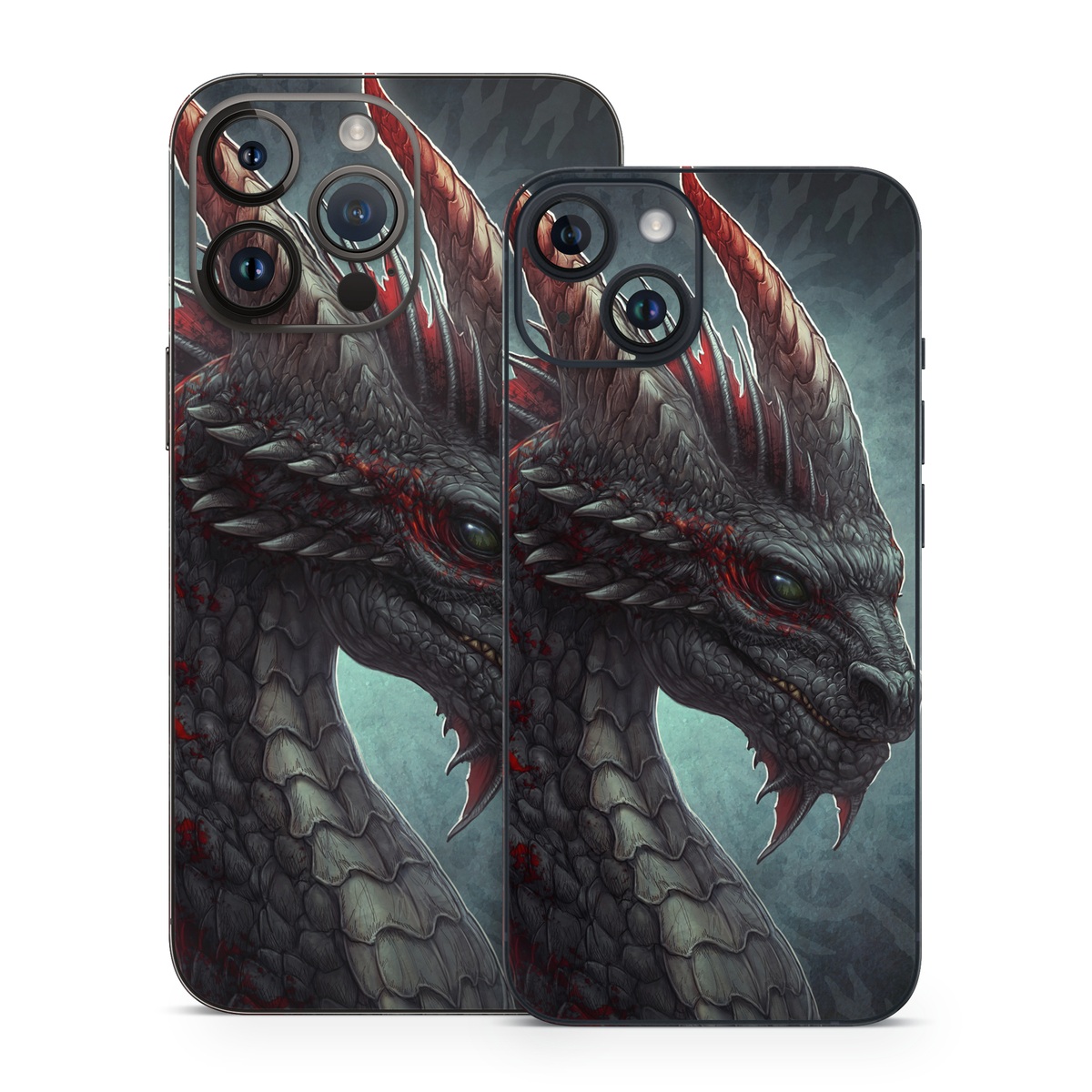 iStyles iPhone 14 Series Skin design of Dragon, Fictional character, Mythical creature, Demon, Cg artwork, Illustration, Green dragon, Supernatural creature, Cryptid, with red, gray, blue colors, and tagged with fantasy, animals.