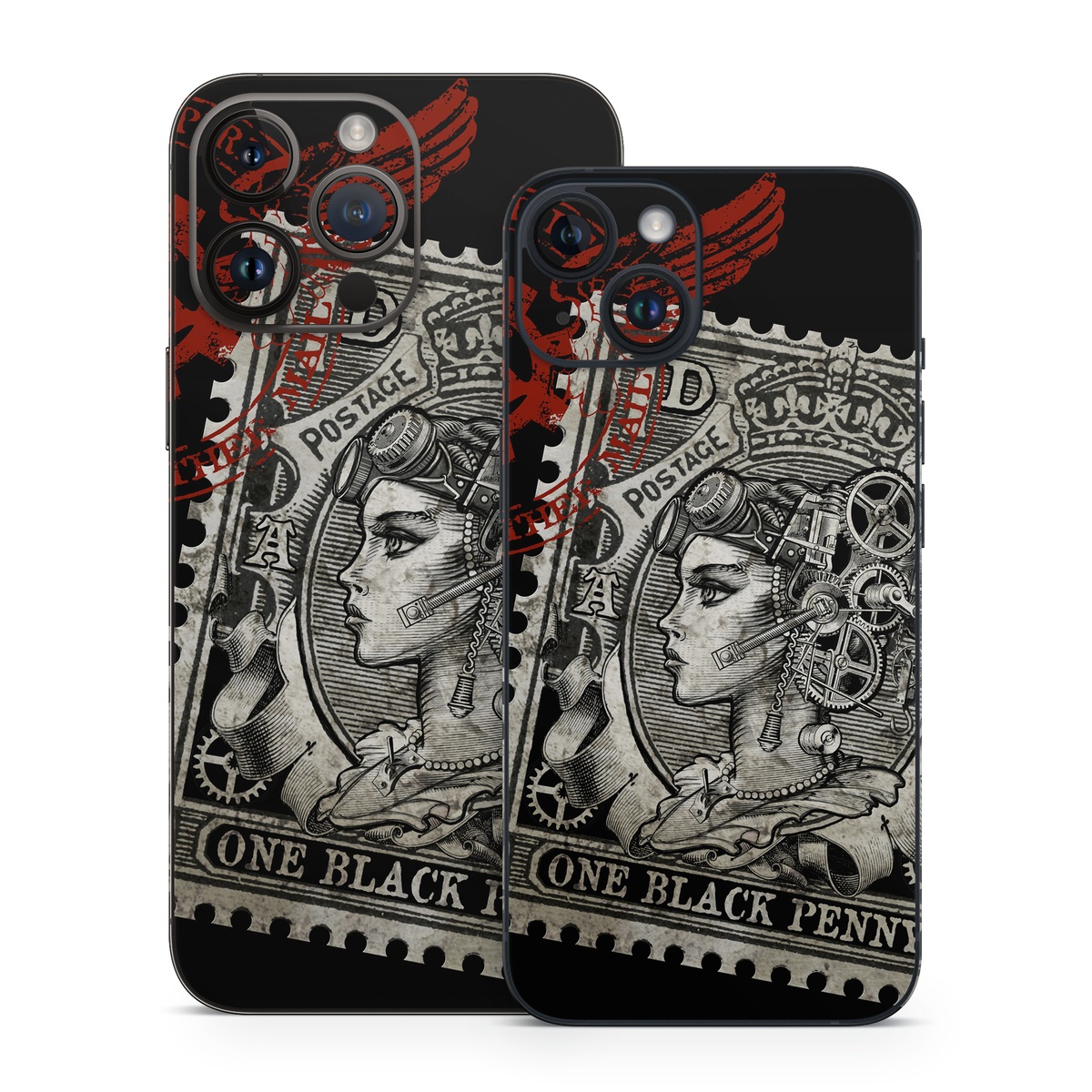 iStyles iPhone 14 Series Skin design of Font, Postage stamp, Illustration, Drawing, Art, with black, gray, red colors, and tagged with people, objects, signs.