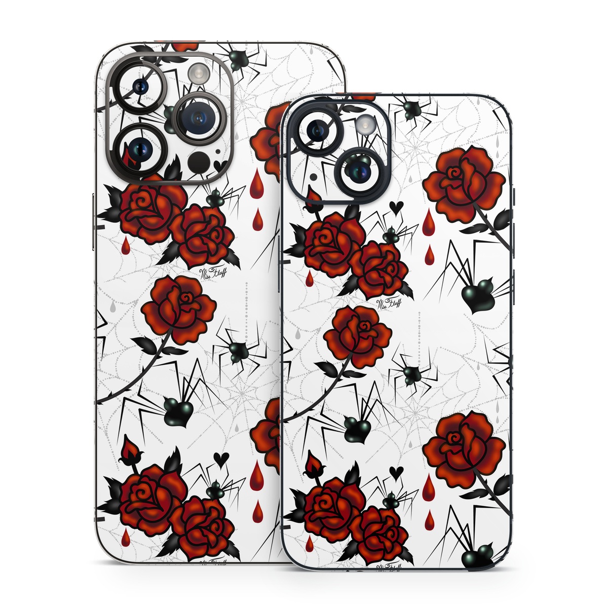 iStyles iPhone 14 Series Skin design of Red, Pattern, Flower, Plant, Design, Floral design, Petal, Coquelicot, Wildflower, Rose, with black, white, red colors, and tagged with animals, flowers, blackwidows, #halloween, roses, spiderwebs, spiders, spooky, tattoo.