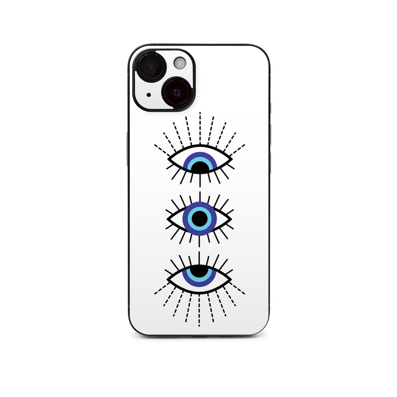 iStyles iPhone 14 Series Skin design of Eyebrow, Eyelash, Iris, Art, Font, Circle, Electric blue, Symmetry, Illustration, Graphics, with black, white, blue, purple colors, and tagged with signs, people, blue, evileye, eye.