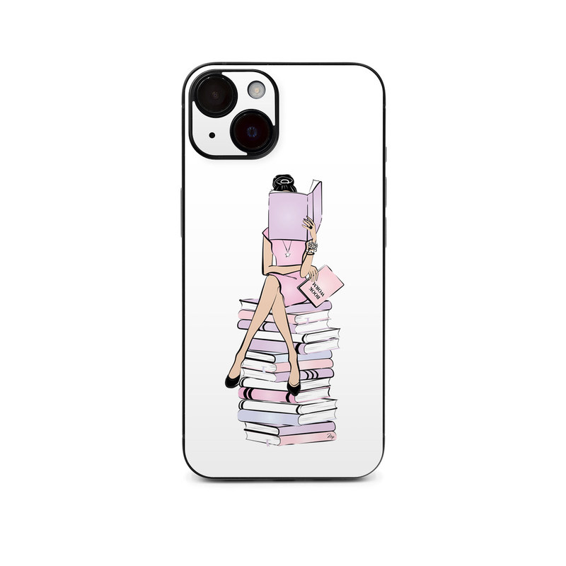 iStyles iPhone 14 Series Skin design of Gesture, Art, Cartoon, Font, Drawing, Illustration, Painting, Fictional character, Animation, Diagram, with black, white, pink, purple, blue, yellow, brown colors, and tagged with signs, objects, people, books, girl, pink, purple, reading.