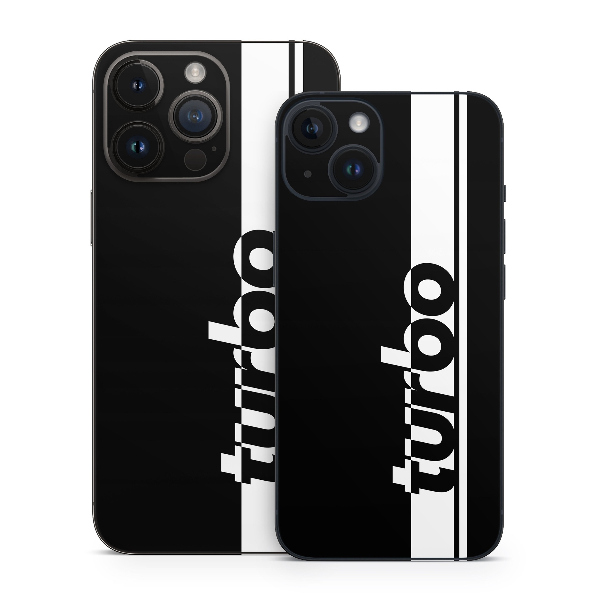 iStyles iPhone 14 Series Skin design of Font, Tints and shades, Rectangle, Electric blue, Logo, Brand, Graphics, Pattern, Darkness, Monochrome photography, with black, white colors, and tagged with signs, lookslike, turbo, racecar.