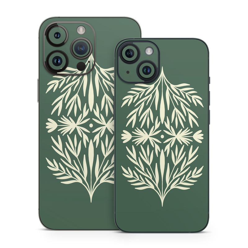 iStyles iPhone 14 Series Skin design of Plant, Terrestrial plant, Art, Triangle, Symmetry, Pattern, Electric blue, Graphics, Grass, Visual arts, with green, white colors, and tagged with patterns, nature, tree, branches, leaves.