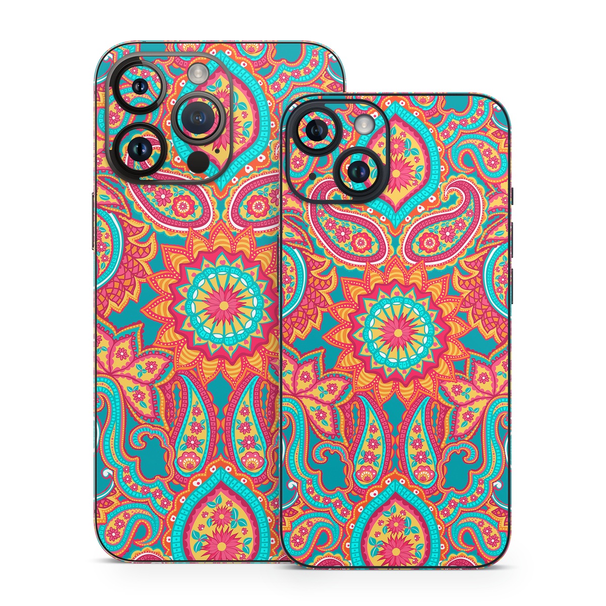 iStyles iPhone 14 Series Skin design of Pattern, Paisley, Motif, Visual arts, Design, Art, Textile, Psychedelic art, with orange, yellow, blue, red colors, and tagged with patterns, flowers.