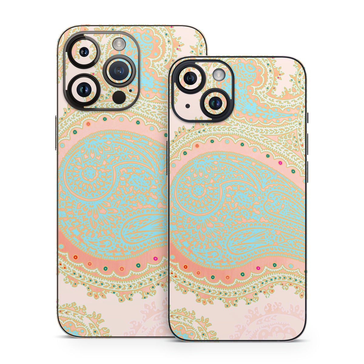 iStyles iPhone 14 Series Skin design of Pattern, Visual arts, Paisley, Pink, Design, Motif, Line, Wallpaper, Peach, with pink, blue, red colors, and tagged with patterns, flowers, brightcolors, girly, paisley, pattern, pink.