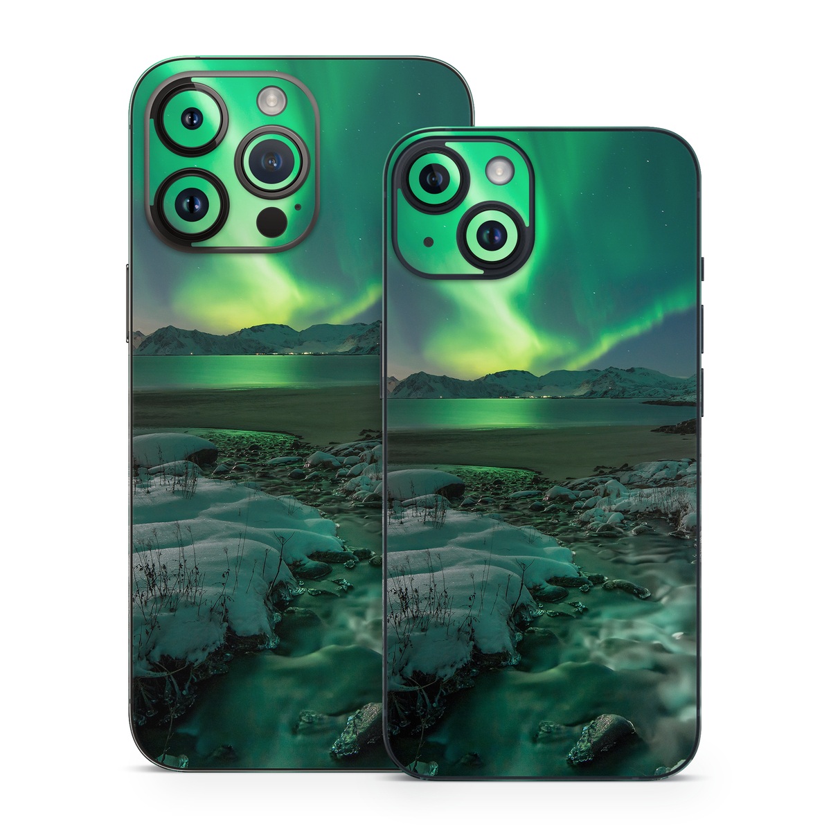 iStyles iPhone 14 Series Skin design of Nature, Aurora, Sky, Geological phenomenon, Water, Atmosphere, Space, Landscape, World, Glacier, with white, green, blue, black, gray colors, and tagged with nature, photos, arctic, cold, mountains, northernlights, photography, snow.
