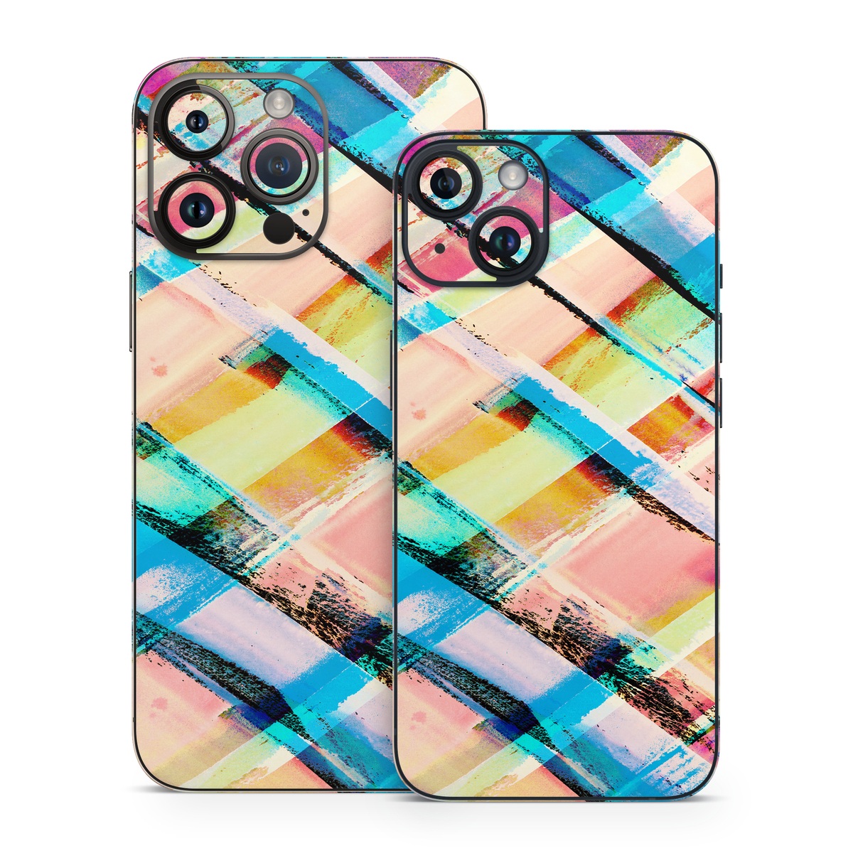 iStyles iPhone 14 Series Skin design of Line, Pattern, Turquoise, Plaid, Orange, Colorfulness, Design, Textile, Tints and shades, with blue, pink, red, purple, yellow, orange colors, and tagged with patterns, abstract, bright, pastel, stripes, watercolor.