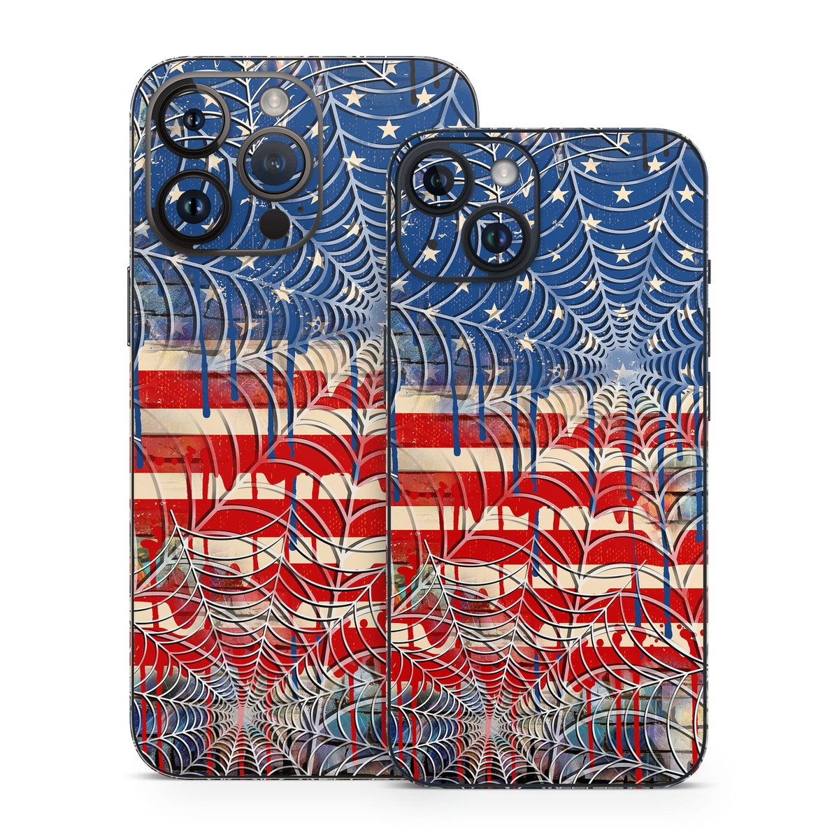iStyles iPhone 14 Series Skin design of Graffiti, Art, Pattern, Flag, Street art, Line, Textile, Mural, Modern art, with red, blue, white, black colors, and tagged with patterns, flags, animals, bricks, cobweb, flag, spider, usa, web.